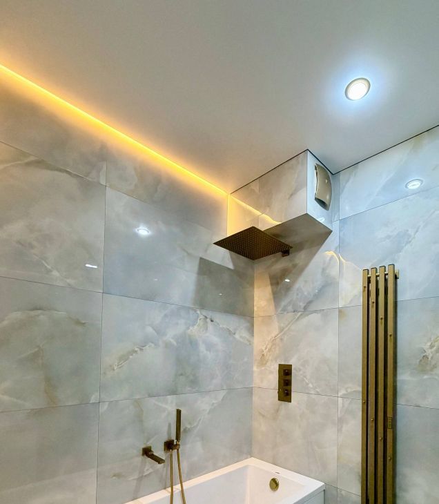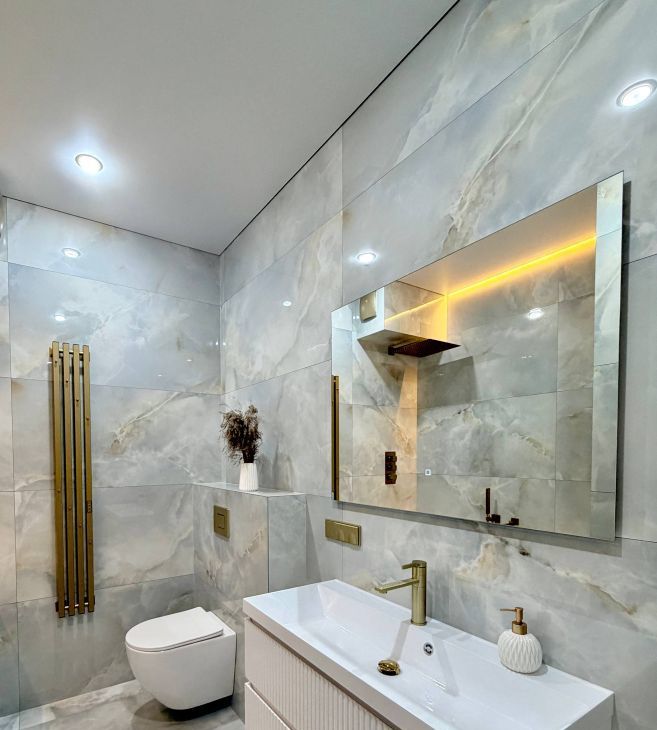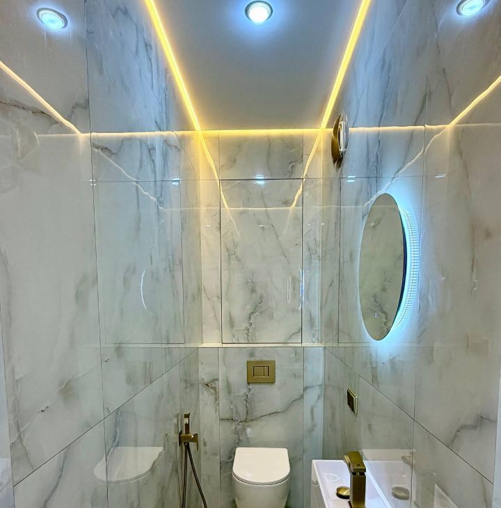 В квартире 2 санузла. Ванная комната, с отделкой из крупноформатного керамогранита с долговечной эпоксидной затиркой. Установлен система теплого пола. Сантехника от качественный производителей. Гостевой санузел, для удобства
