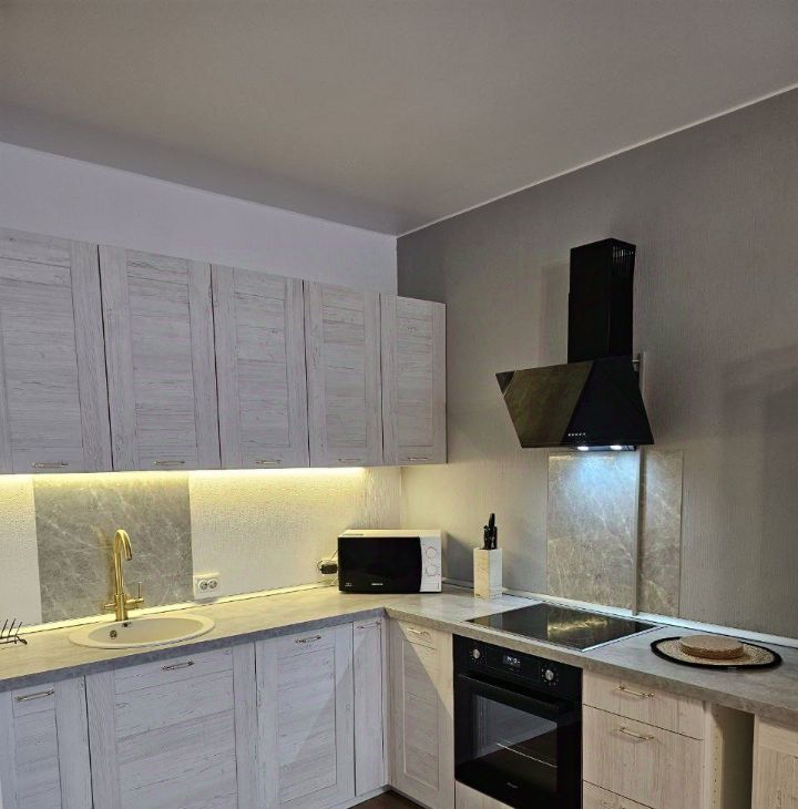 Кухня оснащена всей необходимой техникой - вытяжка, плита, холодильник, духовка, посудомоечная машина.