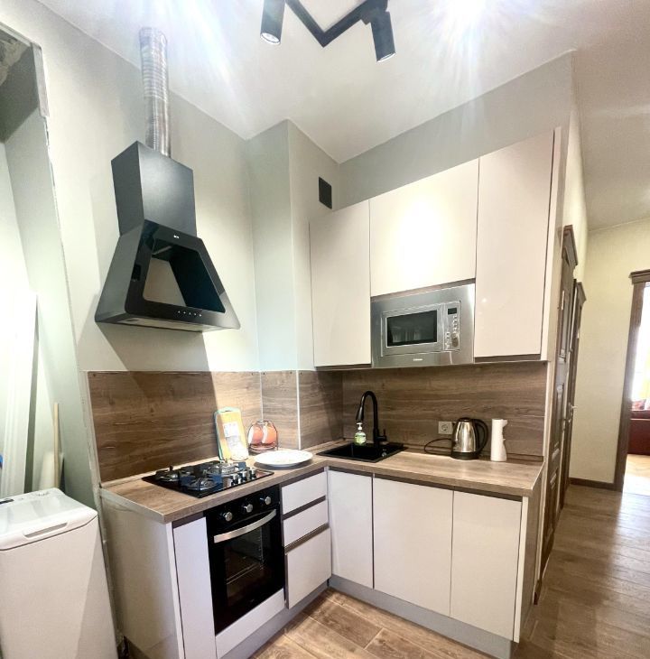 В квартире есть двуспальная кровать, двуспальный диван, и две односпальные кровати. Кухня оборудована всем необходимым:газовая плита, микроволновка, вытяжка, холодильник, посудомоечная машина, столовые приборы. В гостинной телевизор, два кондиционера в комнатах.