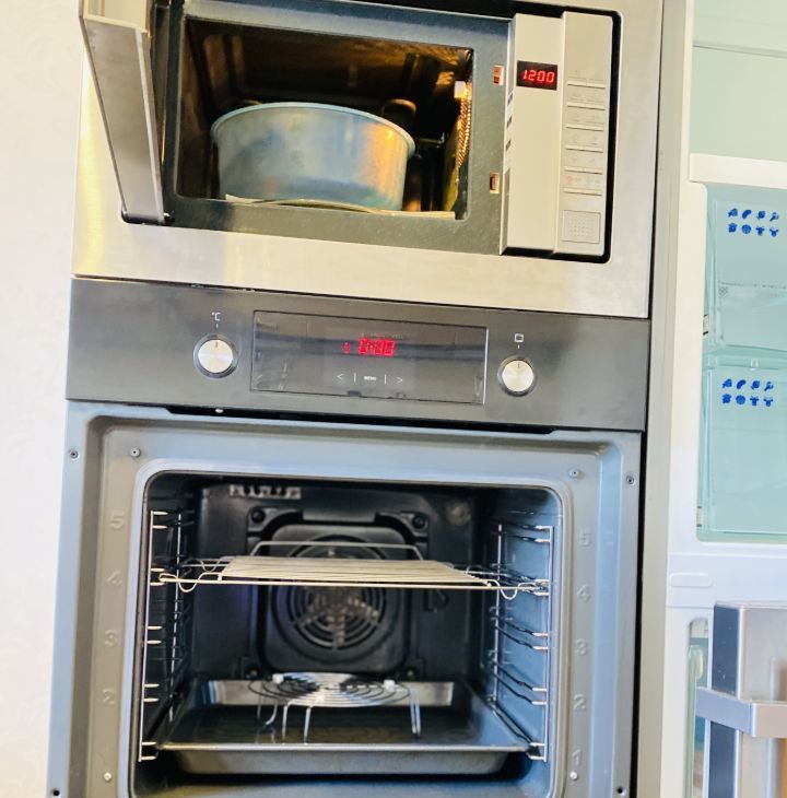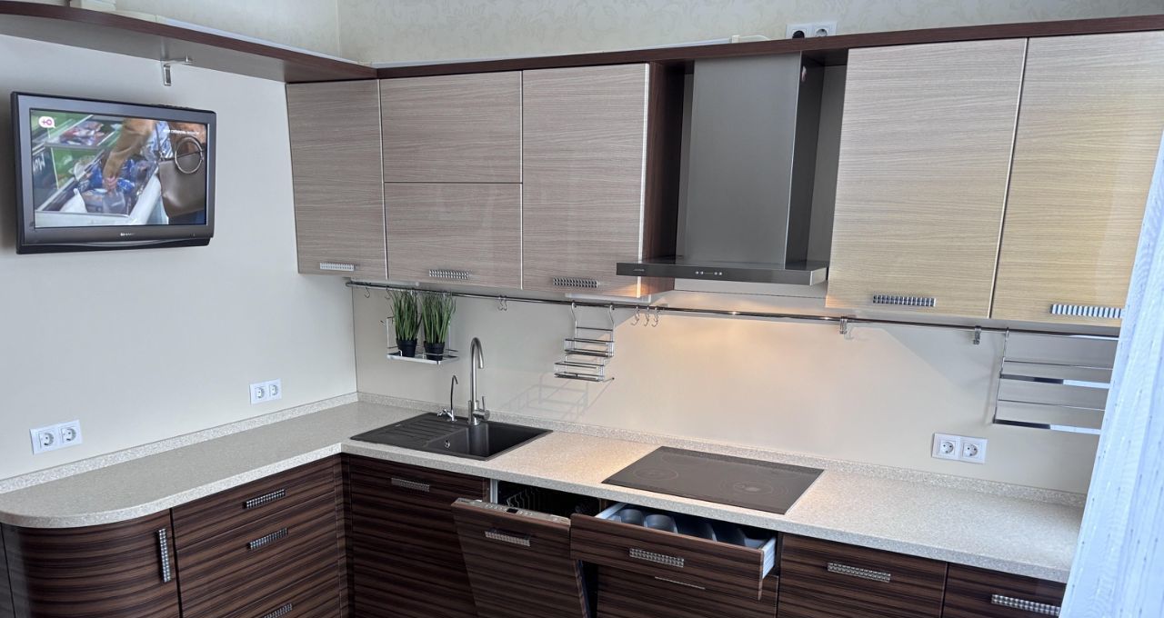 Кухня: вся необходимая техника — духовка, варочная панель, посудомоечная машина, современный холодильник; обеденный стол на 4 персоны