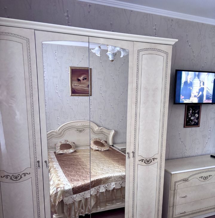 Первая спальня: полный спальный гарнитур — кровать, шкаф, две тумбы, зеркало и телевизор (окна выходят во двор)