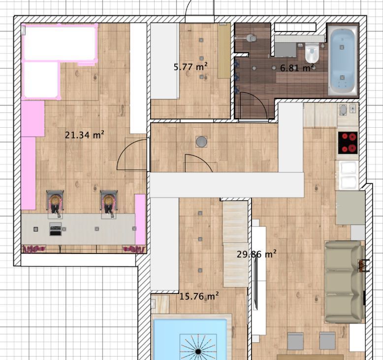 - высокотехнологичная мебель Nolte Kuchen, Mebel & Zeit, сантехника только Grohe и HansGrohe. Двухместная ванна набирается за 7 минут.