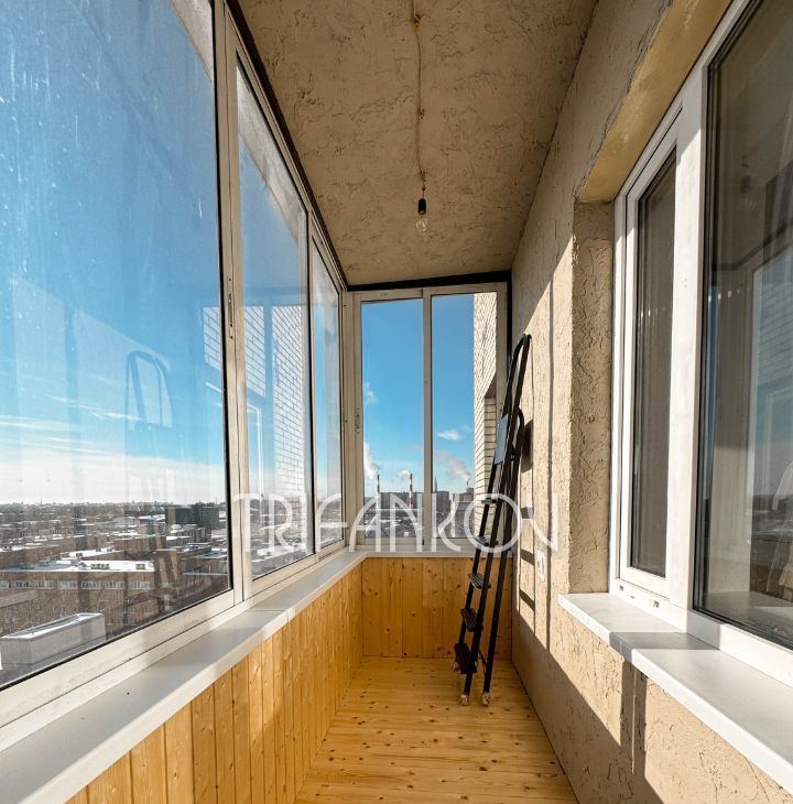 • Лоджия: Застекленная, обшита деревом, с видом на город.