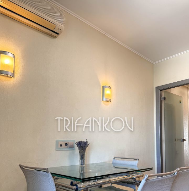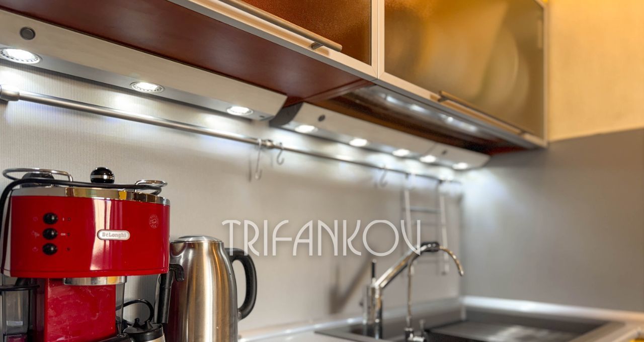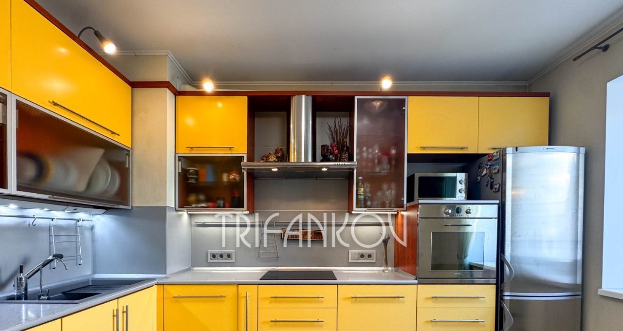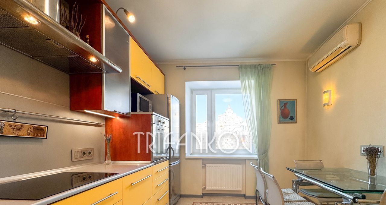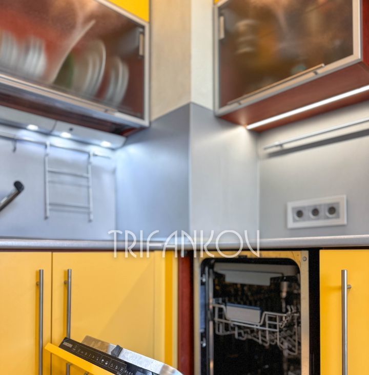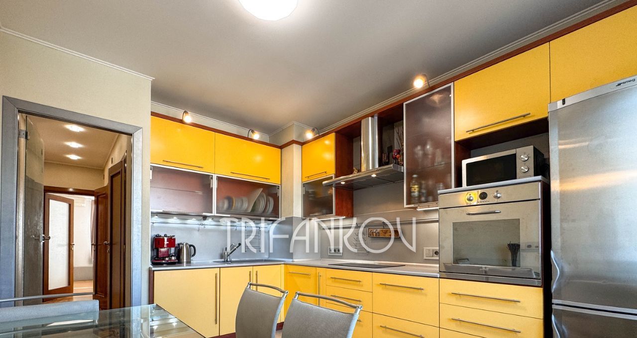 • Кухня: Яркая и стильная. Встроенный гарнитур с современной техникой: варочная панель, духовой шкаф, микроволновая печь, посудомоечная машина и кофемашина. Установлен фильтр для воды. Обеденная зона со стеклянным столом.