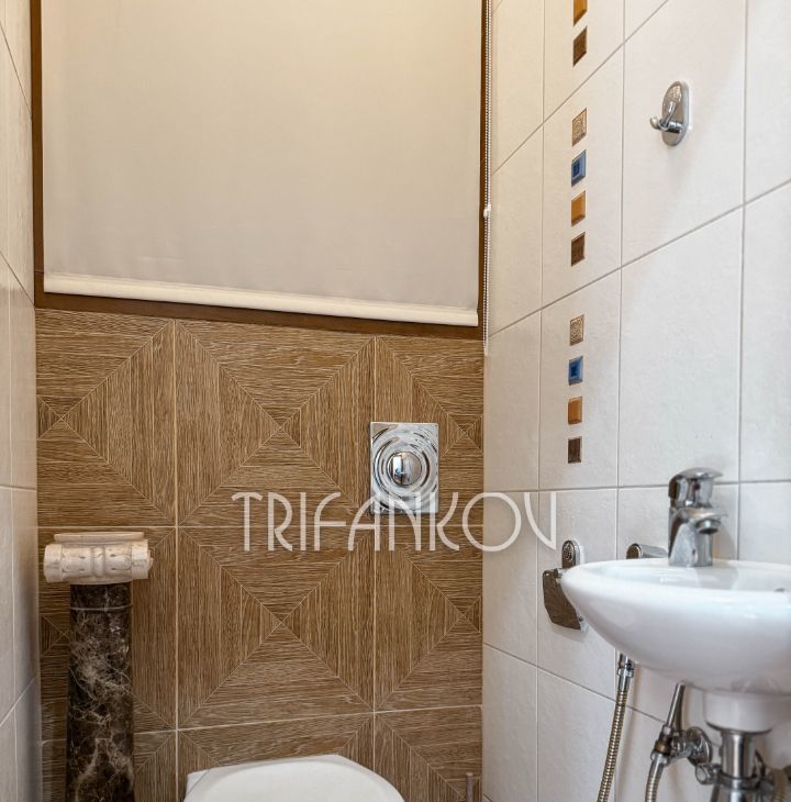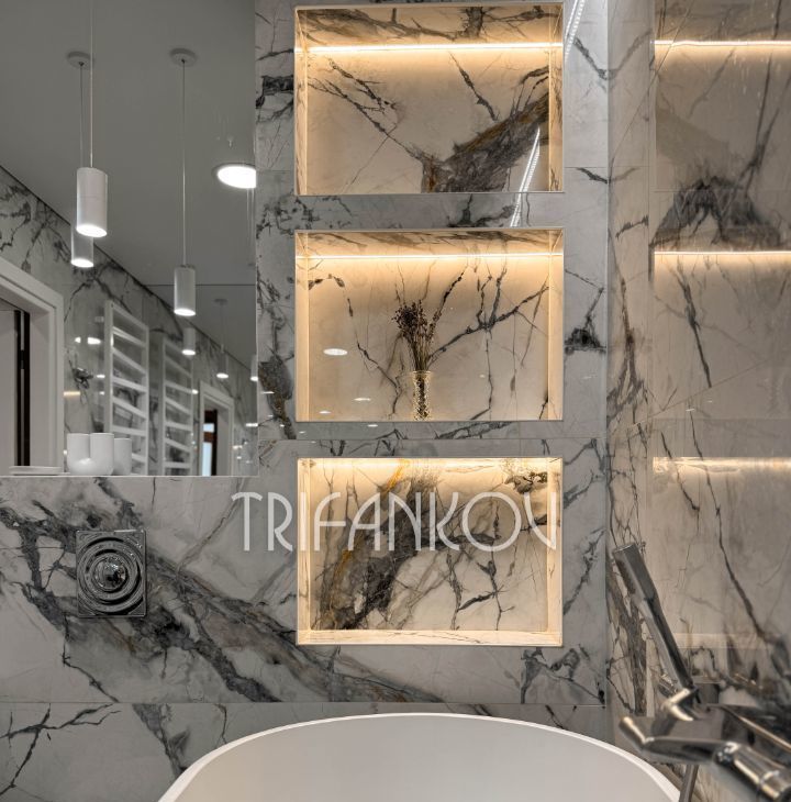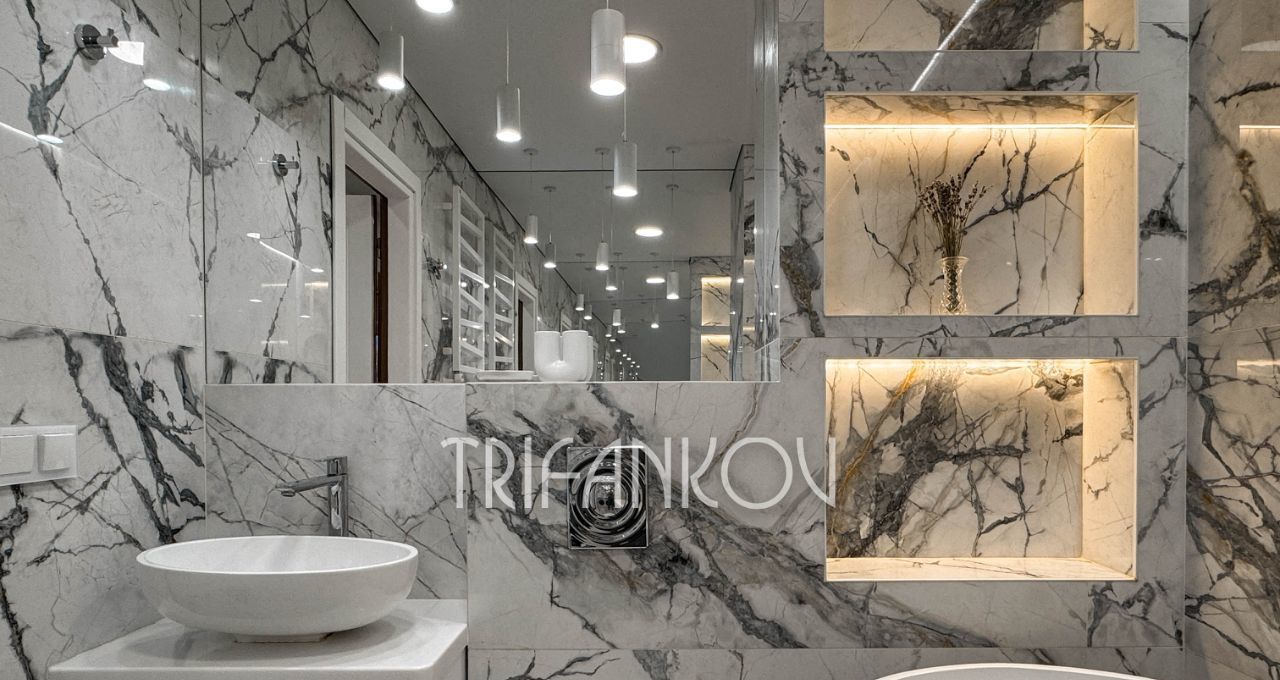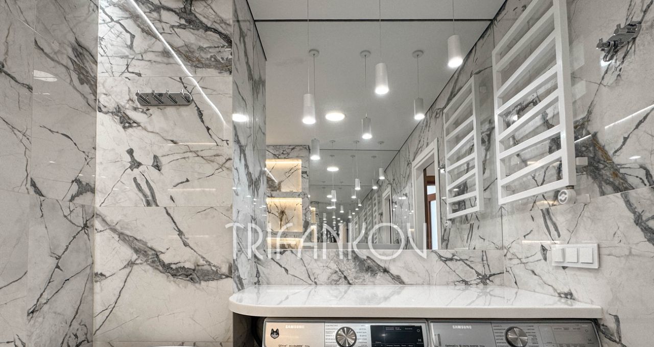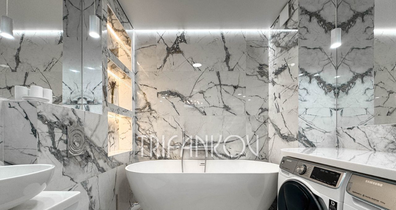 • Ванная комната: Настоящий SPA-салон дома. Отделка под белый мрамор, отдельно стоящая ванна, стильная подсветка ниш. Установлены отдельно стиральная и сушильная машины Samsung — полное решение вопроса стирки.