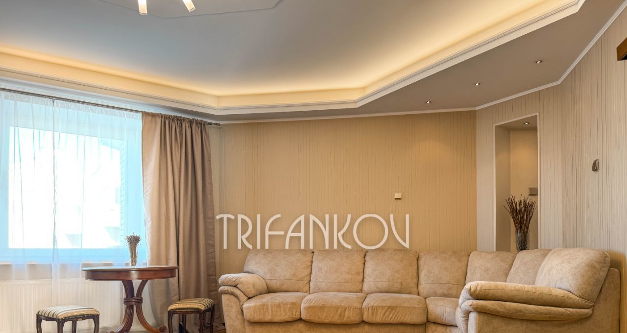• Гостиная: Просторная зона для отдыха с большим угловым диваном, ТВ-зоной и классическим интерьером. Предусмотрена красивая подсветка потолка.