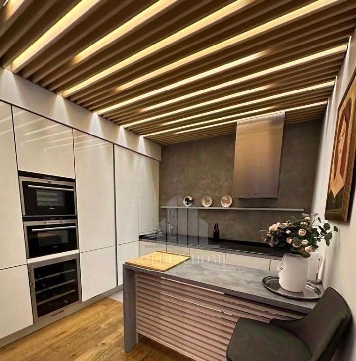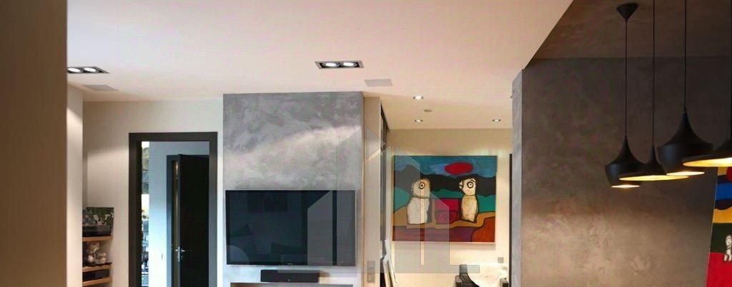 Просторная кухня-гостиная с изысканным освещением.