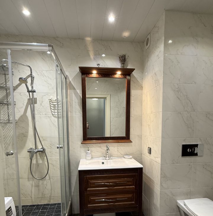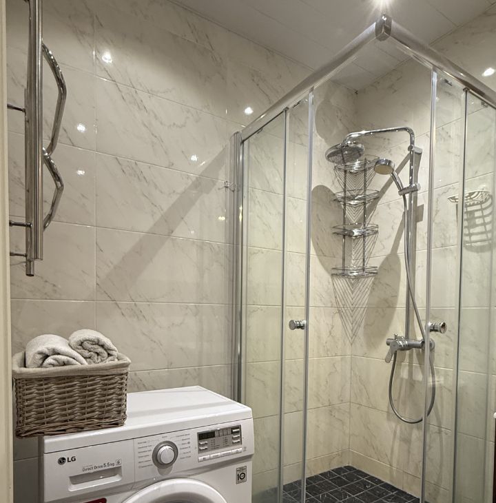 Два санузла в квартире: один гостевой, а второй совмещённый с душевой кабиной.