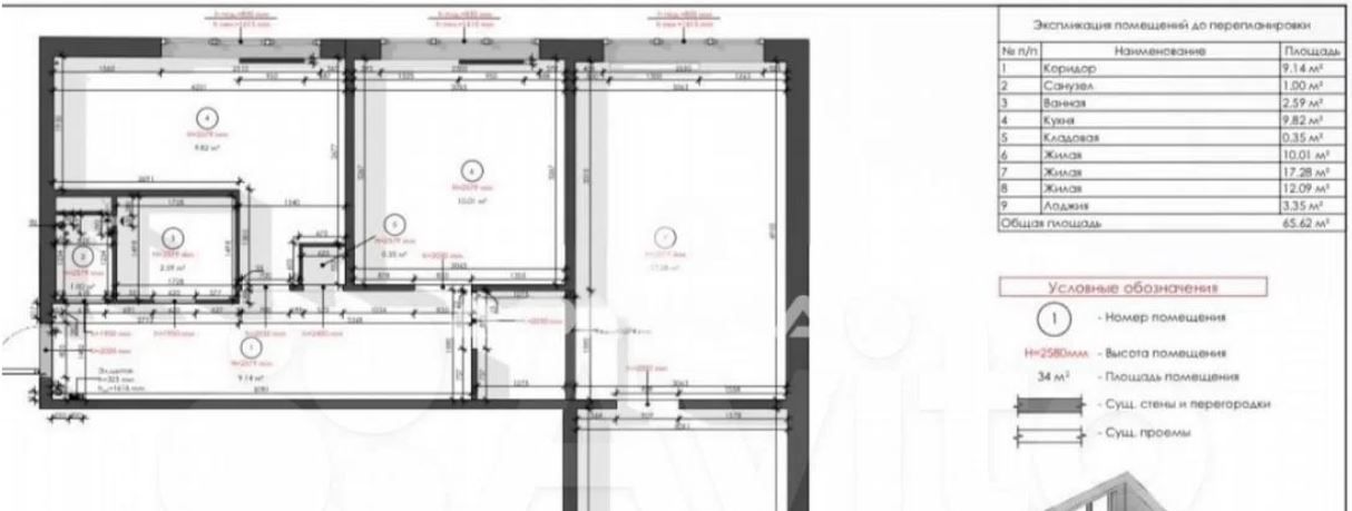 Общая площадь квартиры составляет 65 кв. м, жилая площадь — 42 кв. м, просторная, светлая кухня — 9.5 кв. м.