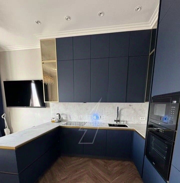 Светлая кухня оборудована всей необходимой техникой: есть холодильник, плита, духовой шкаф, вытяжка и посудомоечная машина. Пространство организовано так, чтобы готовить было удобно и приятно — достаточно места для хранения и рабочая поверхность оптимальной площади.