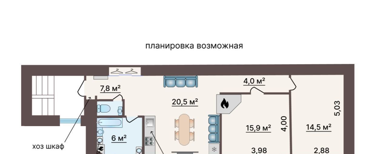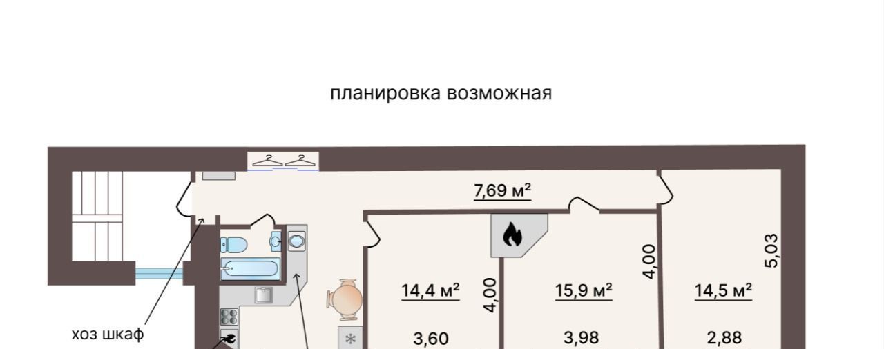 Возможно перепланировать в отличную двухкомнатную квартиру с большой кухней-гостиной, с печью (есть) или современным камином.