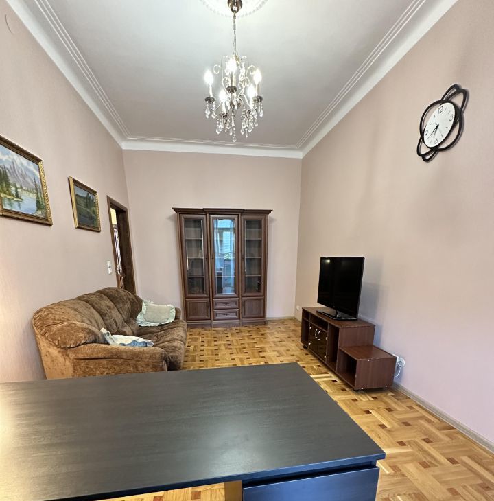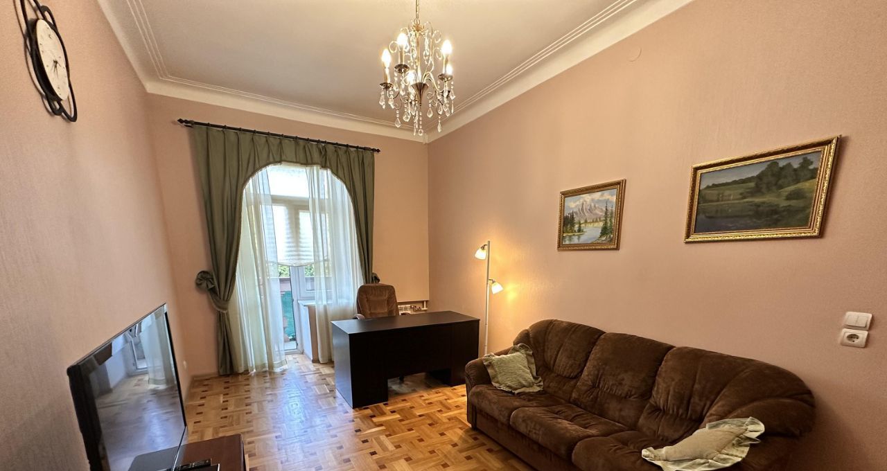 -В комнате-кабинете: двухтумбовый письменный стол, раскладной диван и стеллаж для хранения, тумба , ТВ. Из кабинета выход на балкон, впечатляющий вид на Парк и окрестности.