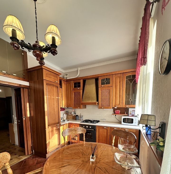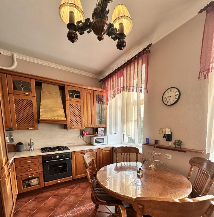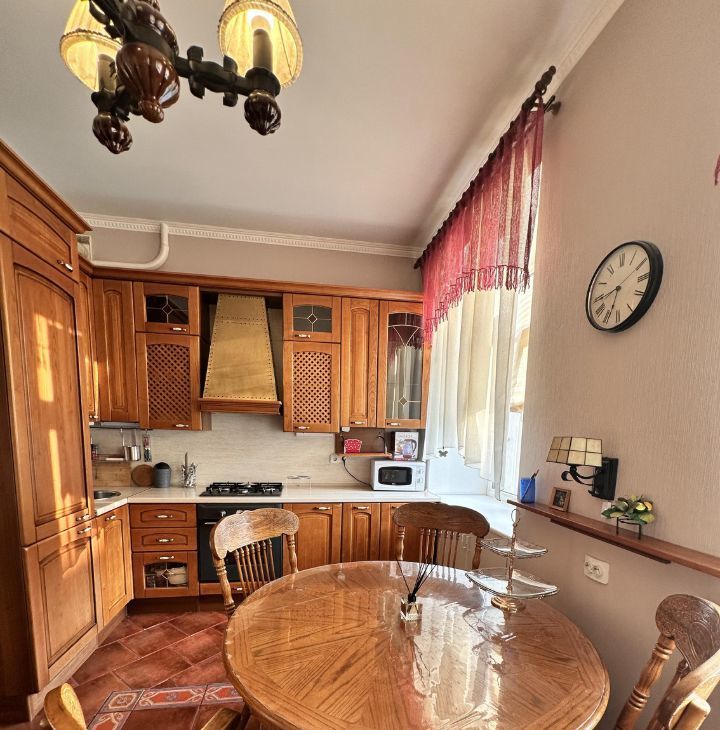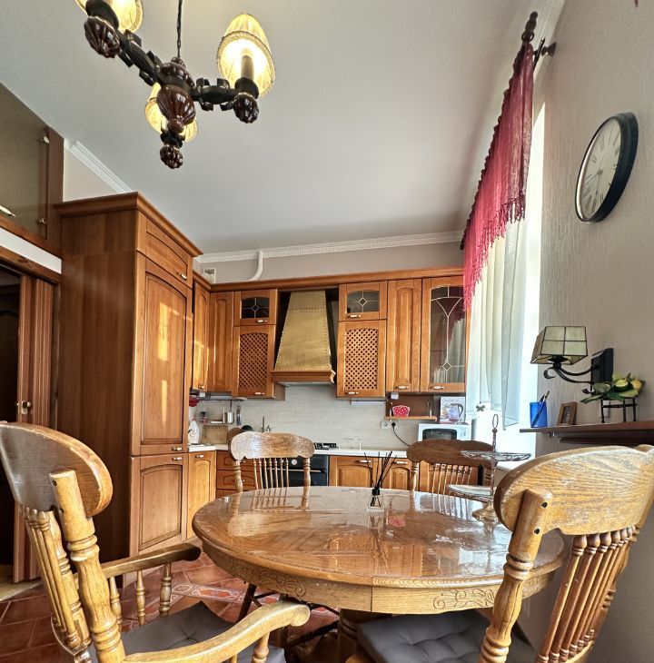 - Встроенная итальянская кухня, газовая панель, духовой шкаф, посудомоечная машина, СВЧ, встроенный холодильник, ТВ, малазийские обеденный стол с 4-мя стульями, кресло, персональный мусоропровод. Два окна на кухни выходят в тихий зеленый двор, где всегда можно запарковать авто.