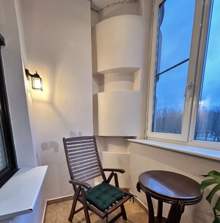 - Гостиная укомплектована раскладным финским диваном с пружинным матрасом, креслом-качалкой(+реклайнер) для релакса, журнальным столиком, горкой для хранения, ТВ. Выход в зимний сад, где есть кресло и кофейный столик. Из окон вид на Парк.