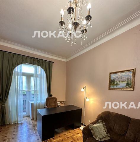 -В комнате-кабинете: двухтумбовый письменный стол, раскладной диван и стеллаж для хранения, тумба , ТВ. Из кабинета выход на балкон, впечатляющий вид на Парк и окрестности.