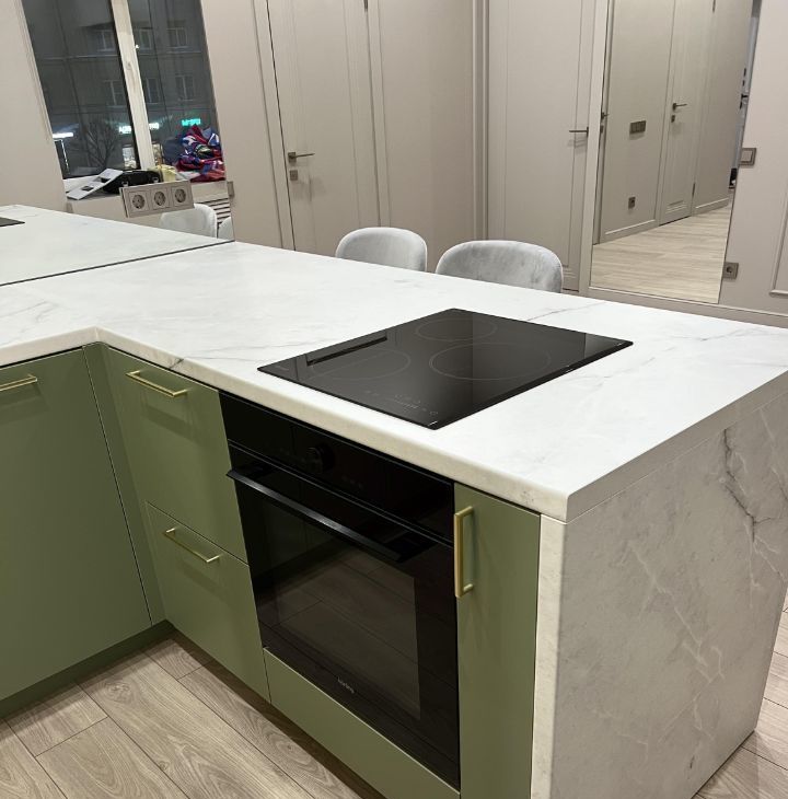 Мебель изготовлена на заказ, встраиваемая техника (холодильник, духовой шкаф с функцией свч, индукционная варочная поверхность, посудомоечная машина).