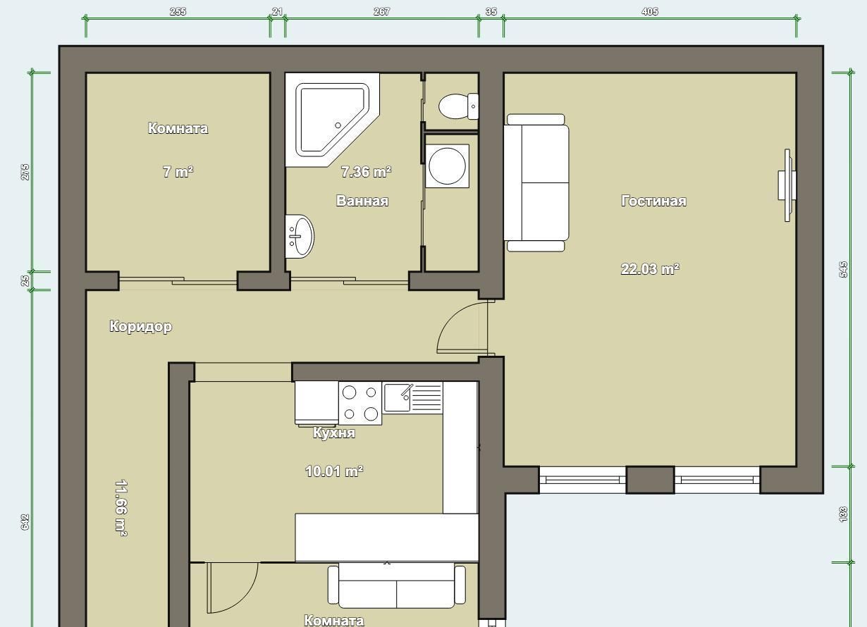 Просторная гостиная — 22 м² (два окна)