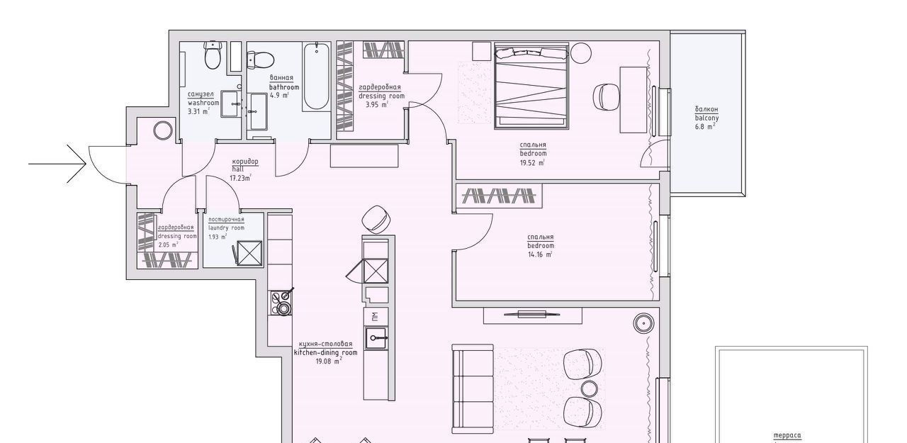 Дизайн-проект от Касабу. Квартира с европланировкой и своей закрытой террасой.