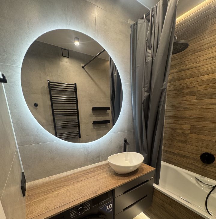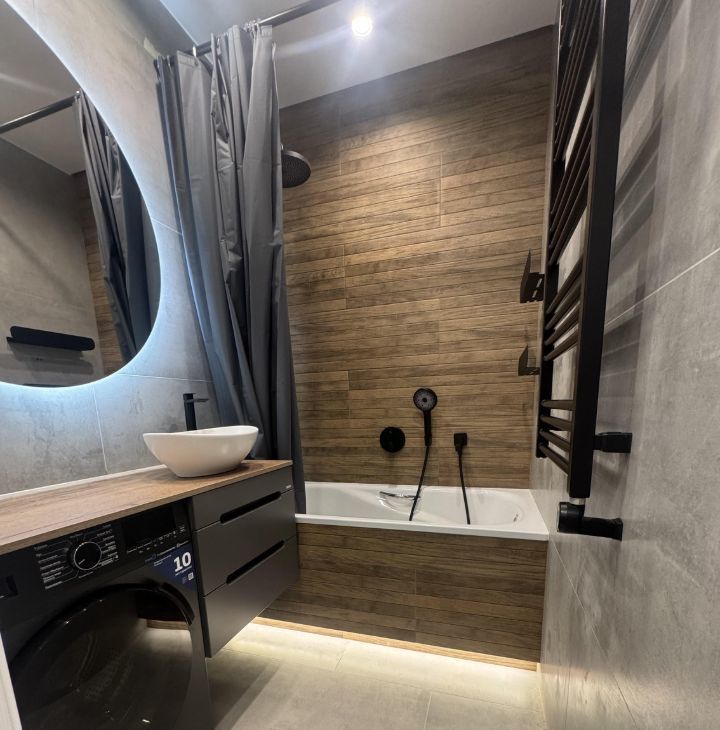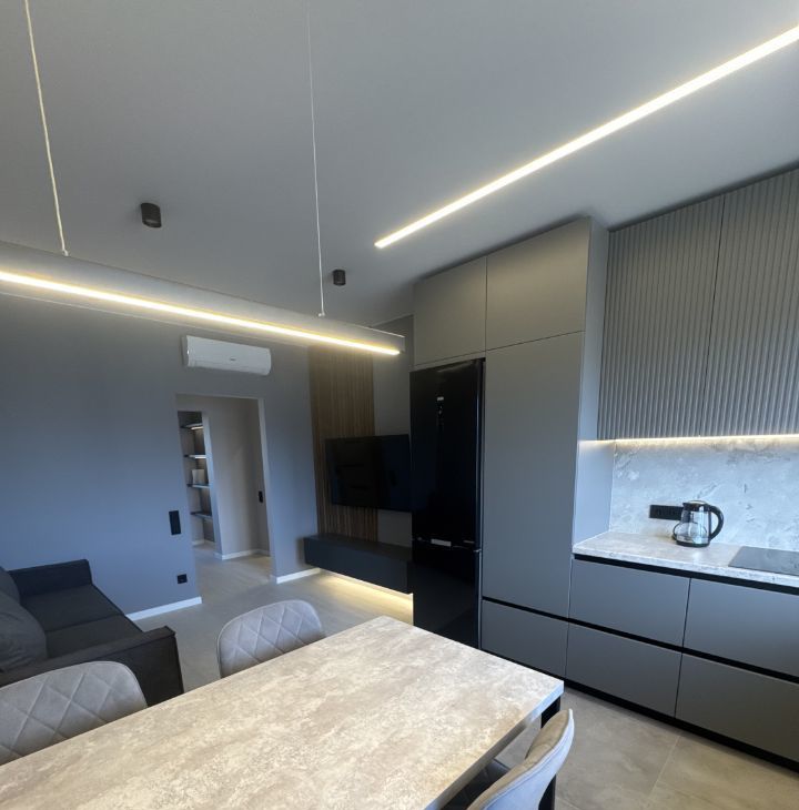 Квартира с дизайнерским ремонтом, готова к комфортному проживанию. В просторной кухне площадью 25 кв. м есть вся необходимая мебель и техника: холодильник, посудомоечная машина, а также кондиционер, чтобы поддерживать комфортную температуру в любое время года. В ванной комнате установлена ванна, а в наличии стиральная машина, чтобы сделать вашу жизнь более удобной.