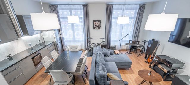 2 комнаты 20 кв.м. и 18 кв.м., 3 санузла, кухня-гостиная 36 кв.м., кладовка 3,5 кв.м., 2 кондиционера. Квартира полностью оборудована всем необходимым. Окна смотрят на 2 корпус и во внутренний двор. Без парковочного места