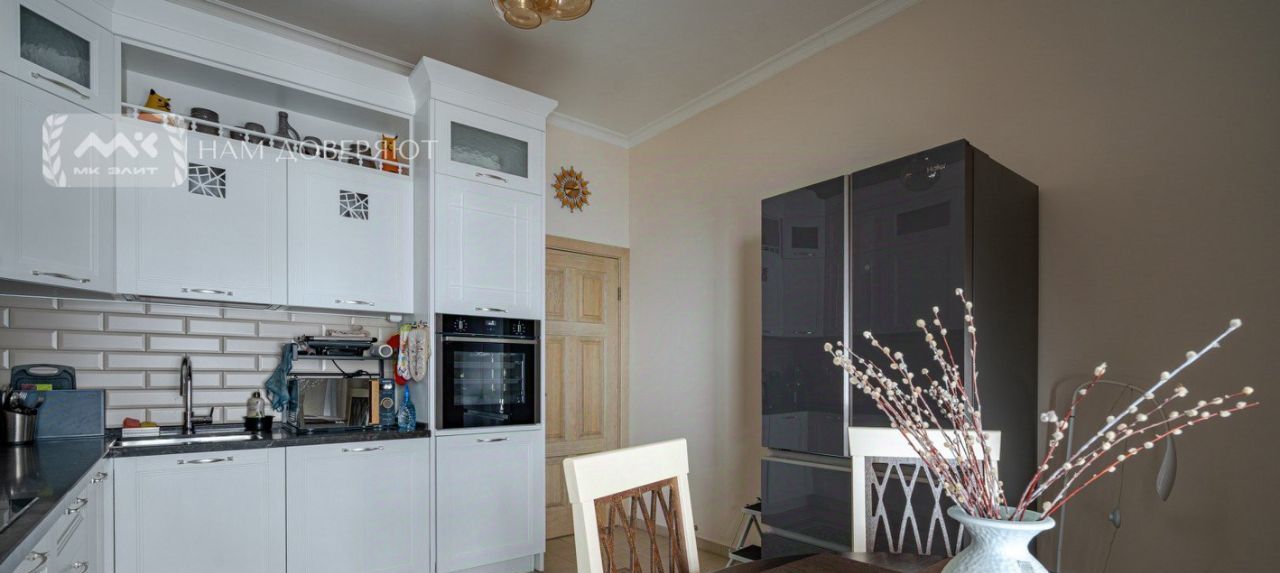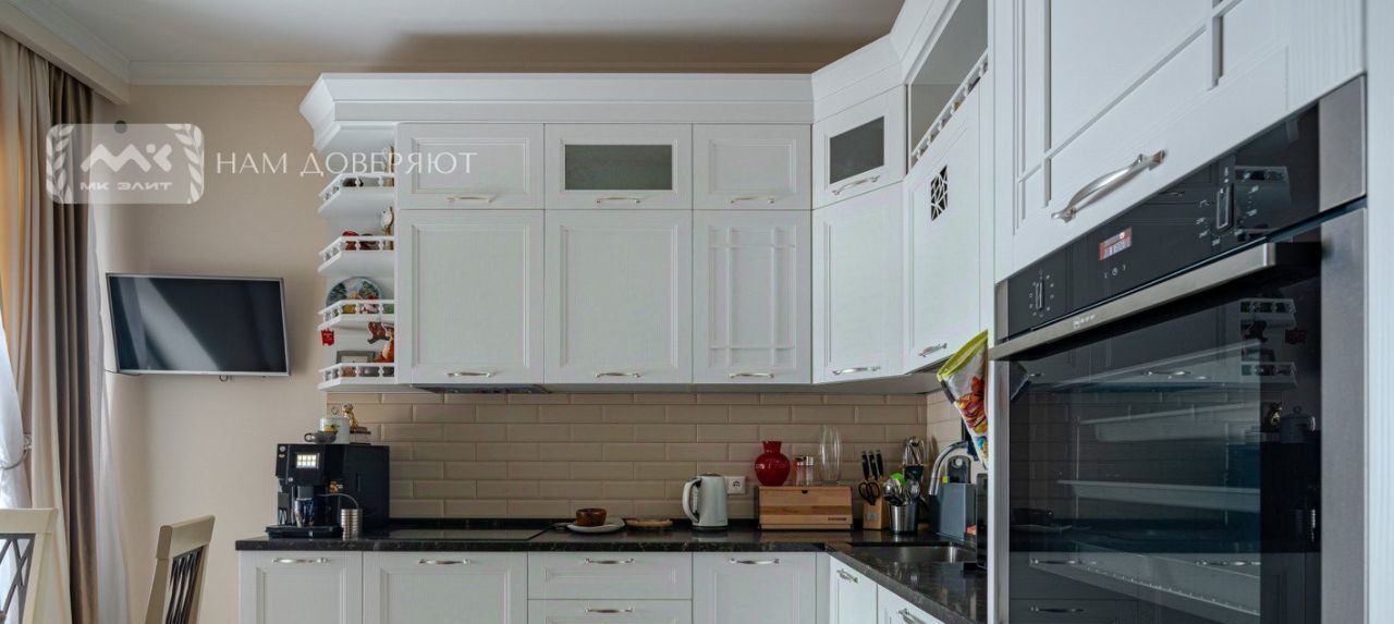 Кухня полностью укомплектована техникой, посудой и кухонной утварью для приготовления пищи: варочная панель, духовой шкаф Neff, холодильник, стиральная машина Electrolux c сушкой, посудомоечная машина Bosh, чайник, микроволновая печь, кофемашина, сэндвич-тостер Tefal.