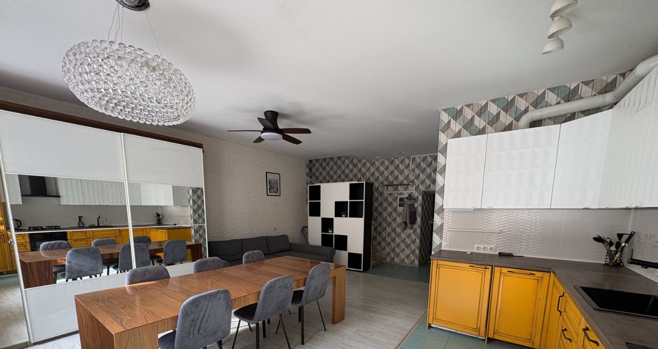 На первом уровне расположена уютная кухня-гостиная с удобным диваном и большим обеденным столом — отличное пространство как для повседневной жизни, так и для приема гостей.