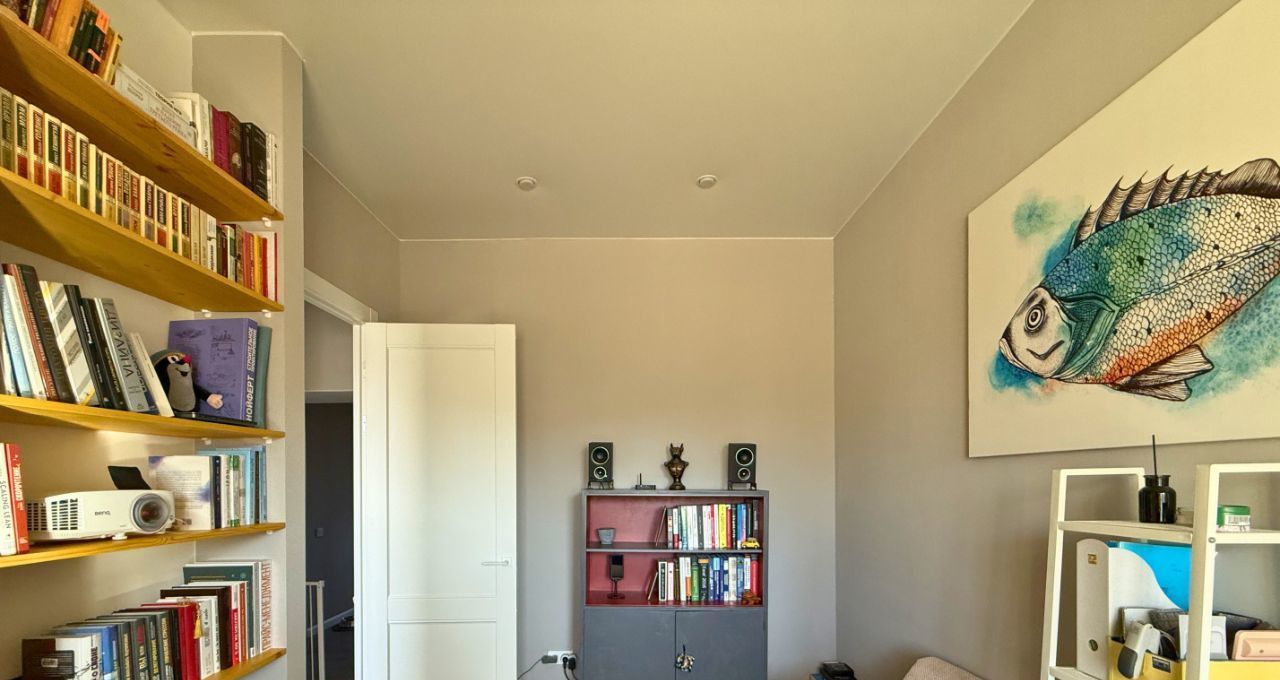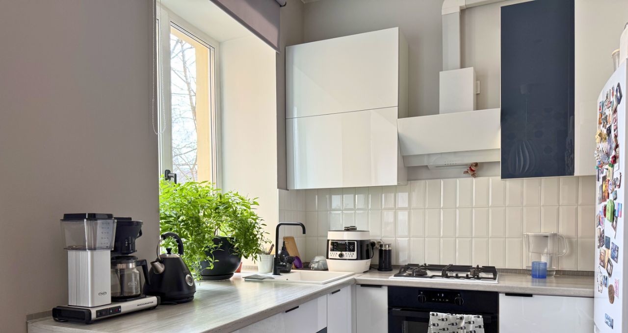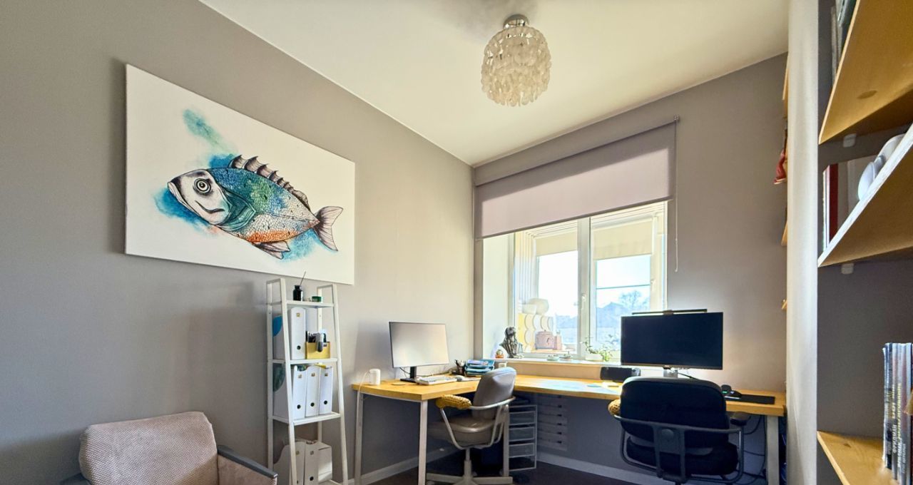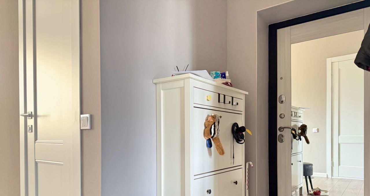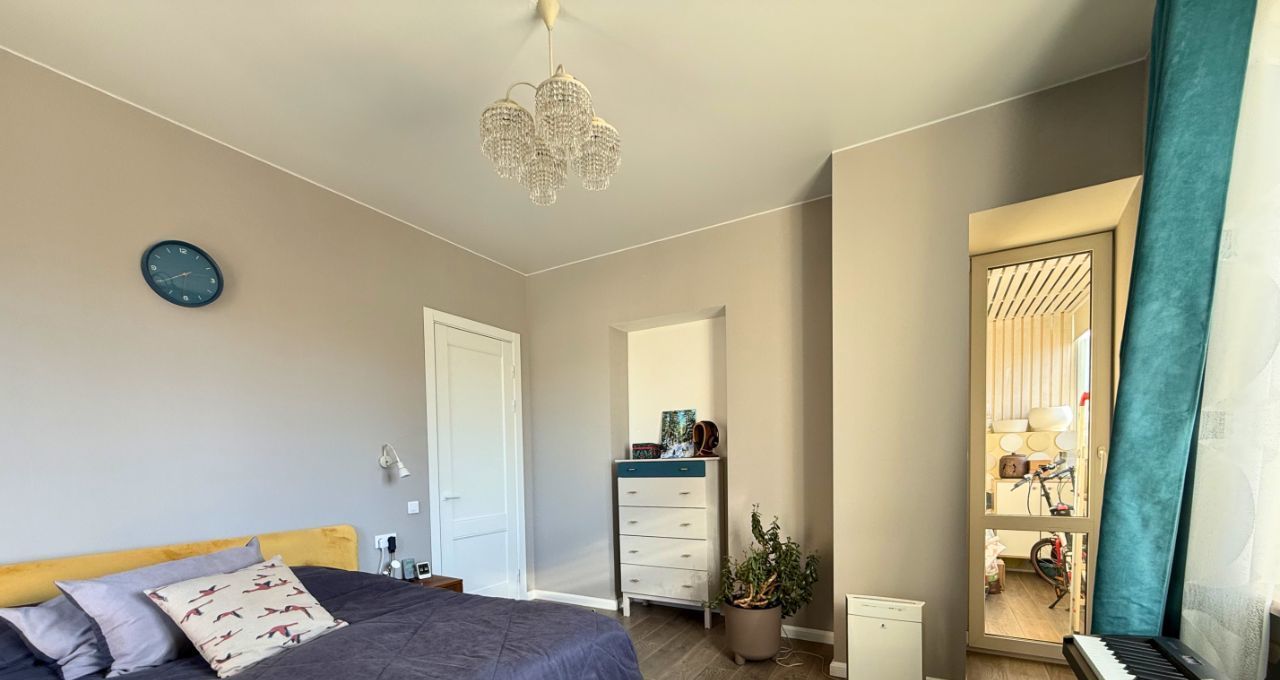 Ремонт завершен в 2022 году. Установлены высокие двери ProfilDoors 2.5 м, итальянская фурнитура Morelli с магнитными замками. Полностью оборудованный кабинет: угловой стол из массива выполнен на заказ точно по размеру стен, книжные полки из массива - до потолка. Санузел раздельный с инсталляцией Grohe, просторная ванная комната, 4.8 кв. м. Есть счетчики на воду. В спальне установлена приточная вентиляция Airnanny с тремя фильтрами очистки и подогревом воздуха. Кухня сделана на фурнитуре Blum, фасады покрыты акриловым пластиком, горячая вода - центральная, без газовой колонки. Есть гардеробная комната со стеллажами до потолка по двум стенам.