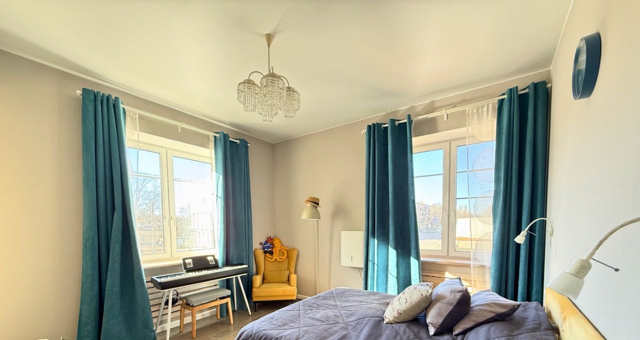 Квартира расположена в доме-объекте культурного наследия, в добротной кирпичной сталинке с толщиной стен до 1 метра. Планировка "распашонка", окна выходят на три стороны, в спальне два окна и лоджия. Хорошее освещение в разное время суток. За счет высоких 3 м потолков и хороших пропорций пространства квартира ощущается действительно объемной и светлой. На лестничной площадке этажа всего 2 квартиры.