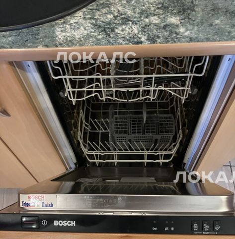 Кухня. Полный кухонный встроенный гарнитур включает в себя электро- плиту, духовку, вытяжку и посудомойку. Помимо барной стойки, пространство кухни позволяет поставить еще и обеденный стол.