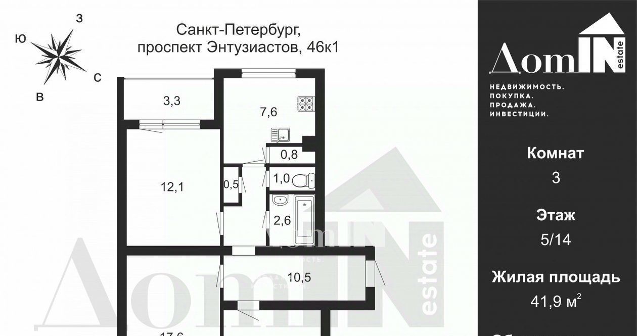 3-комнатная квартира: Санкт-Петербург, проспект Энтузиастов, 46к1 (64.9 м²)