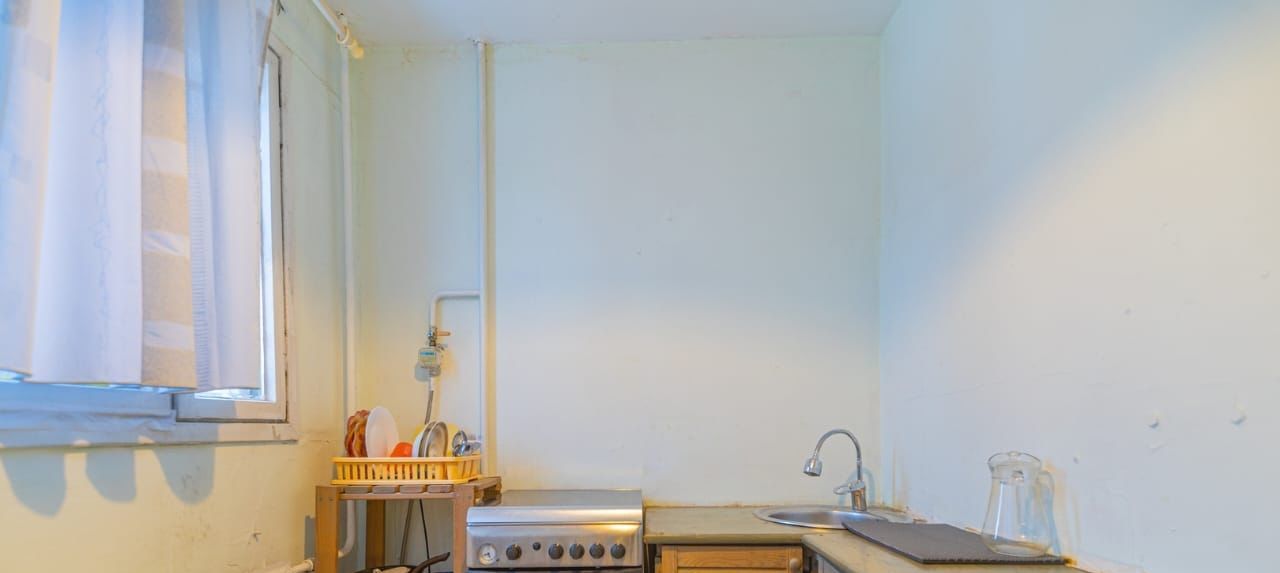 Квартира находится в 14 минутах пешком от станции метро "Юго-Западная". или метро Автово. Общая жилая площадь — 45 кв. м, кухня — 7 кв. м. Высота потолков — 2,55 метра. Лоджия застекленная. Окна выходят на улицу.