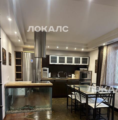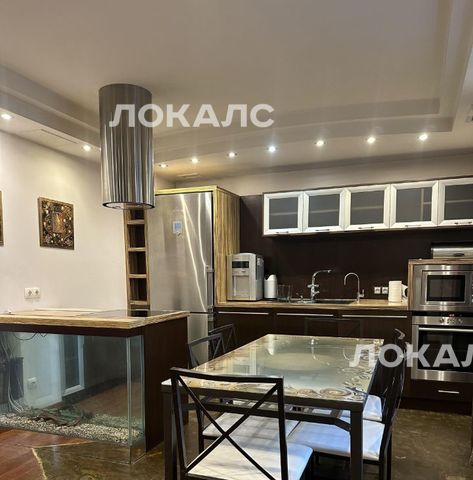 На кухне установлен кухонный гарнитур с аквариумом и вся необходимая бытовая техника: посудомоечная машина, холодильник, вытяжка, варочная панель, стиральная машина, микроволновая печь, кофеварка. Также на кухне оборудован теплый пол.