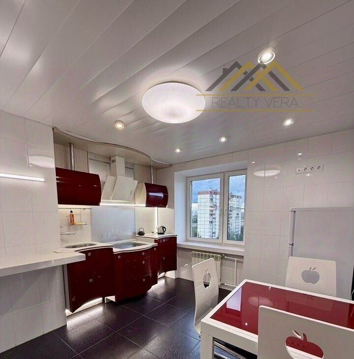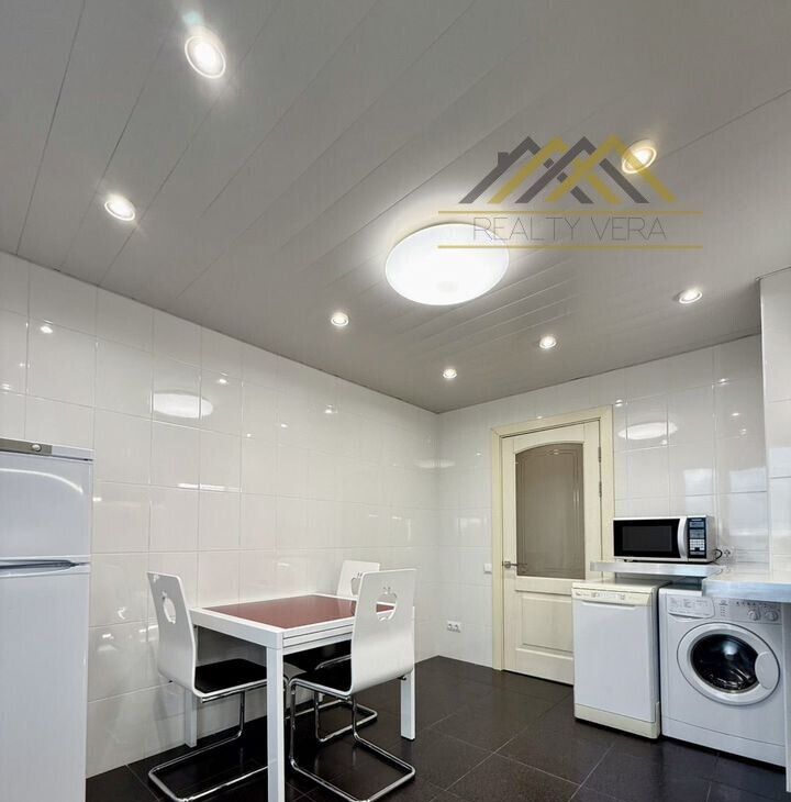 - Кухня: холодильник, посудомоечная машина, варочная поверхность, микроволновая печь, чайник, обеденный стол и стулья.