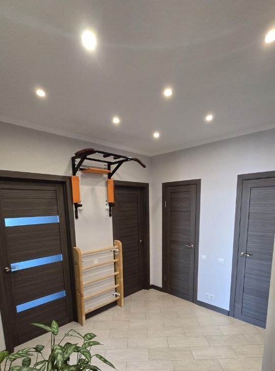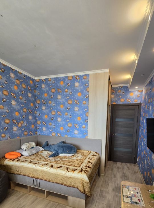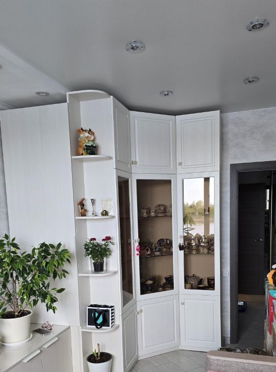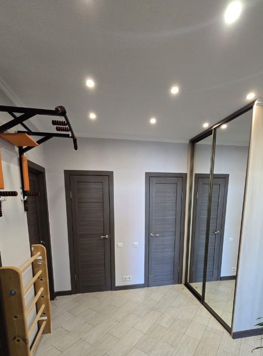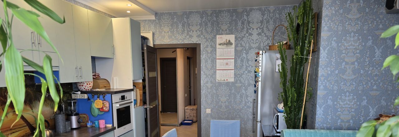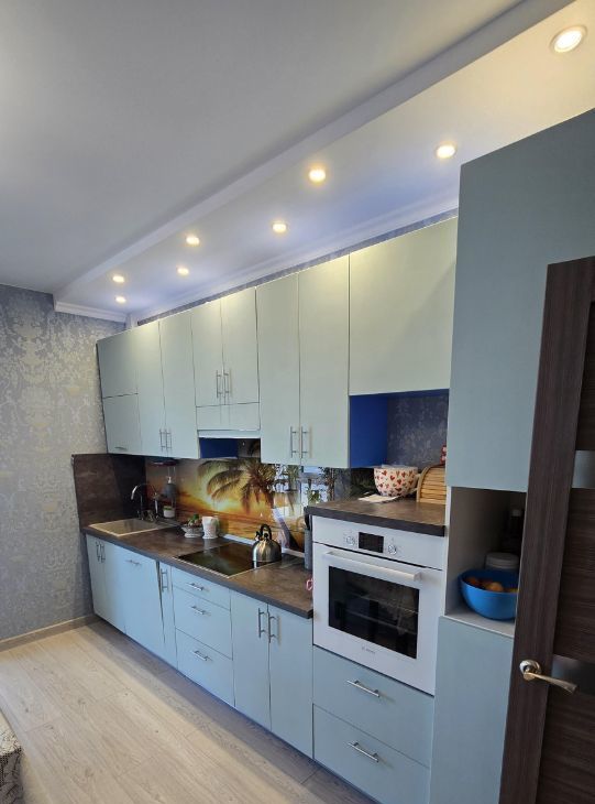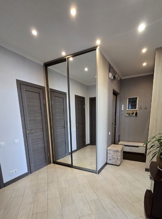 На этаже всего две квартиры, так что за стенами соседей нет. В квартире остаётся кухонная мебель без бытовой техники и три встроенных шкафа-купе. Остальную мебель и технику можно оставить по договорённости.