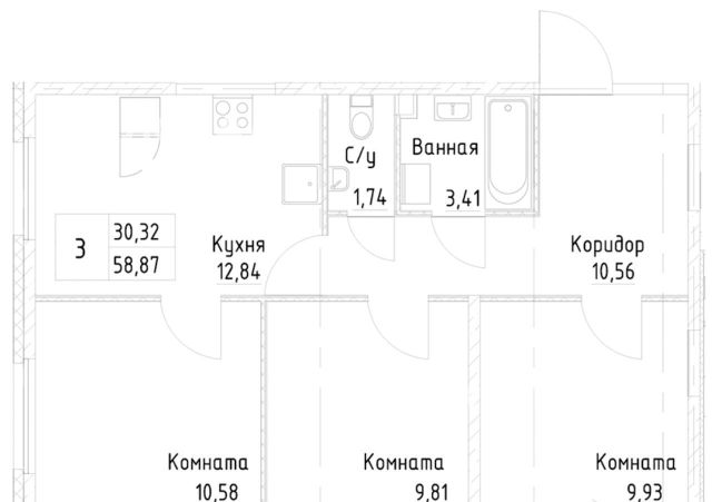3-к кв. Санкт-Петербург ш. Суздальское, 22к3 (59.3 м²)