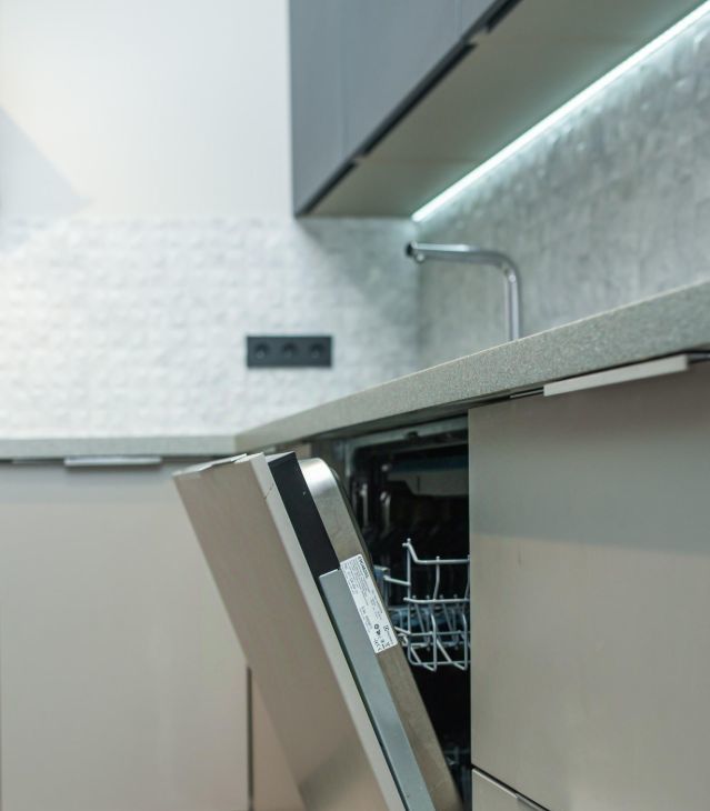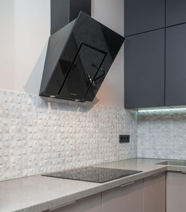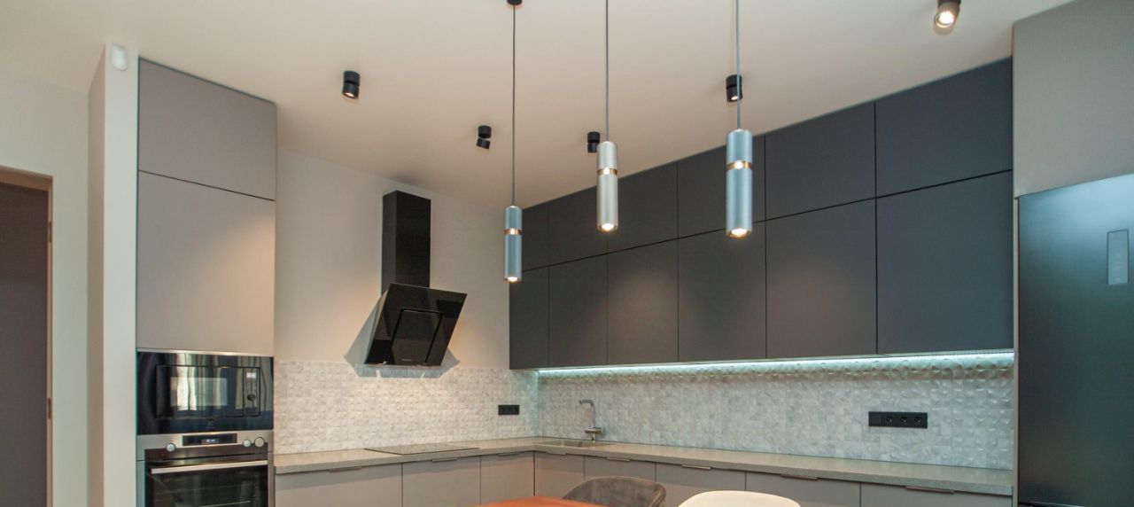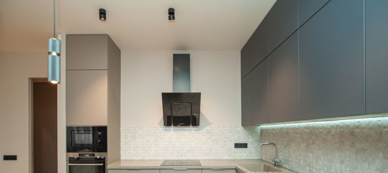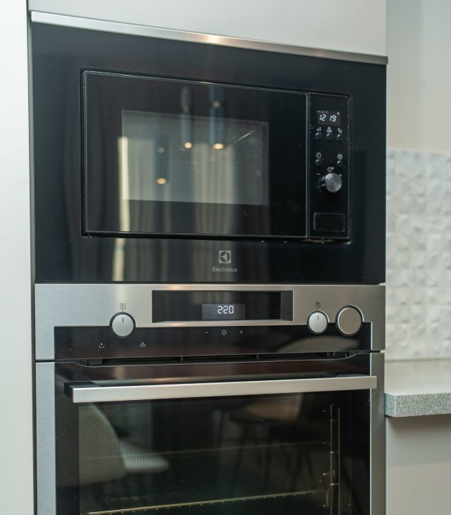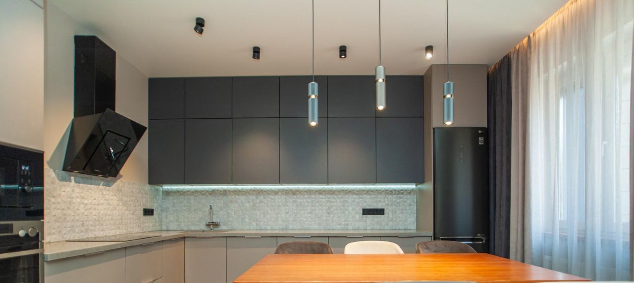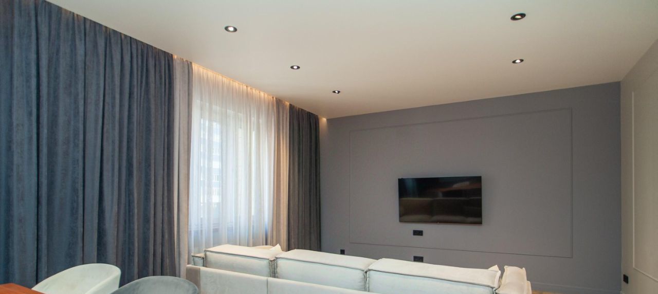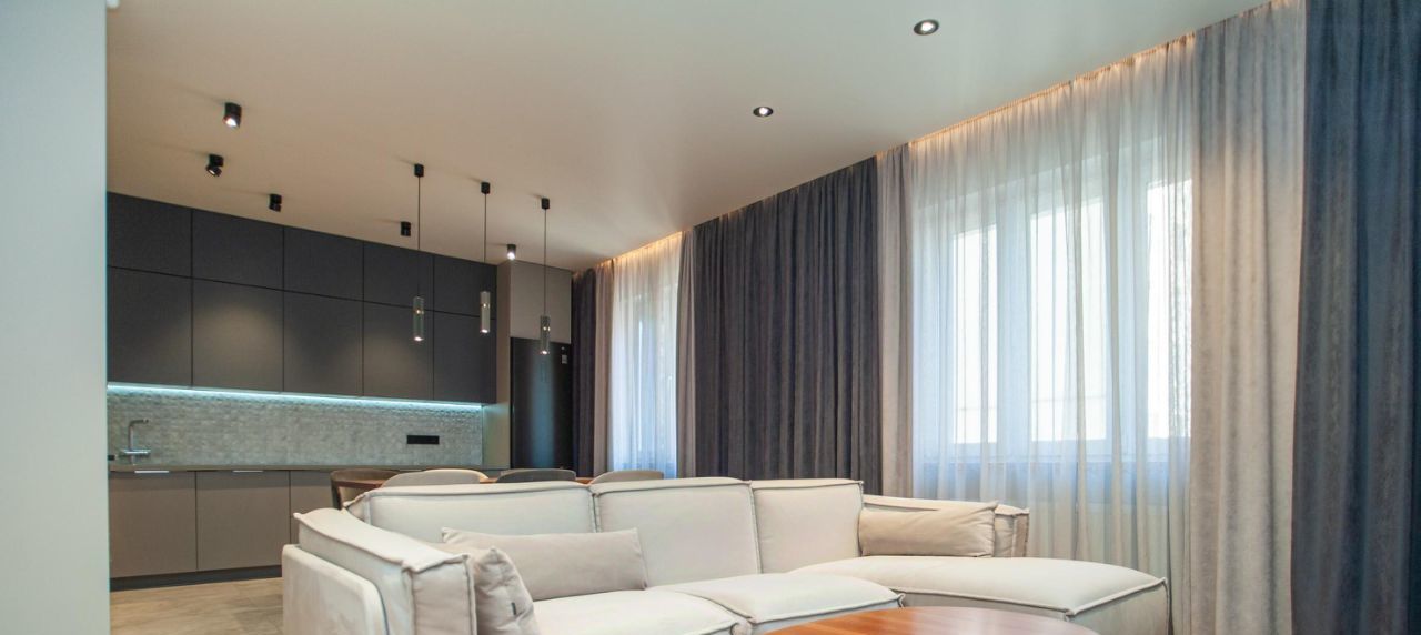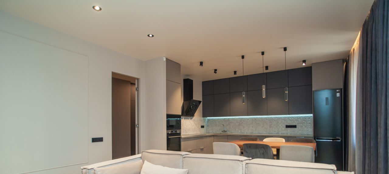 Кухня-гостиная: современная мебель, встроенная техника премиальных брендов (холодильник LG, посудомоечная машина и СВЧ Electrolux, индукционная панель и духовой шкаф AEG, вытяжка Kuppersberg). В гостиной зоне — удобный диван SK Design, большой Smart-TV Samsung и бризер для поддержания чистоты воздуха.