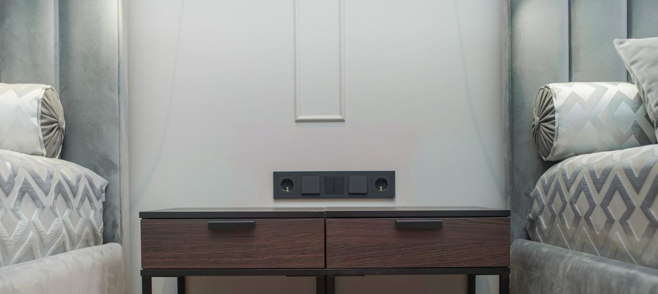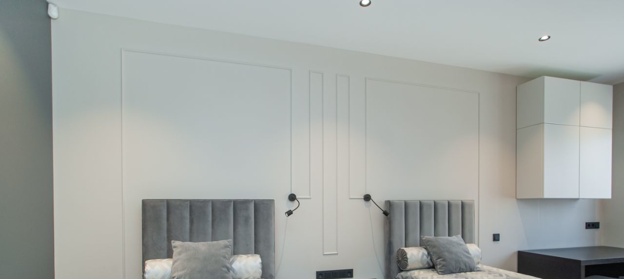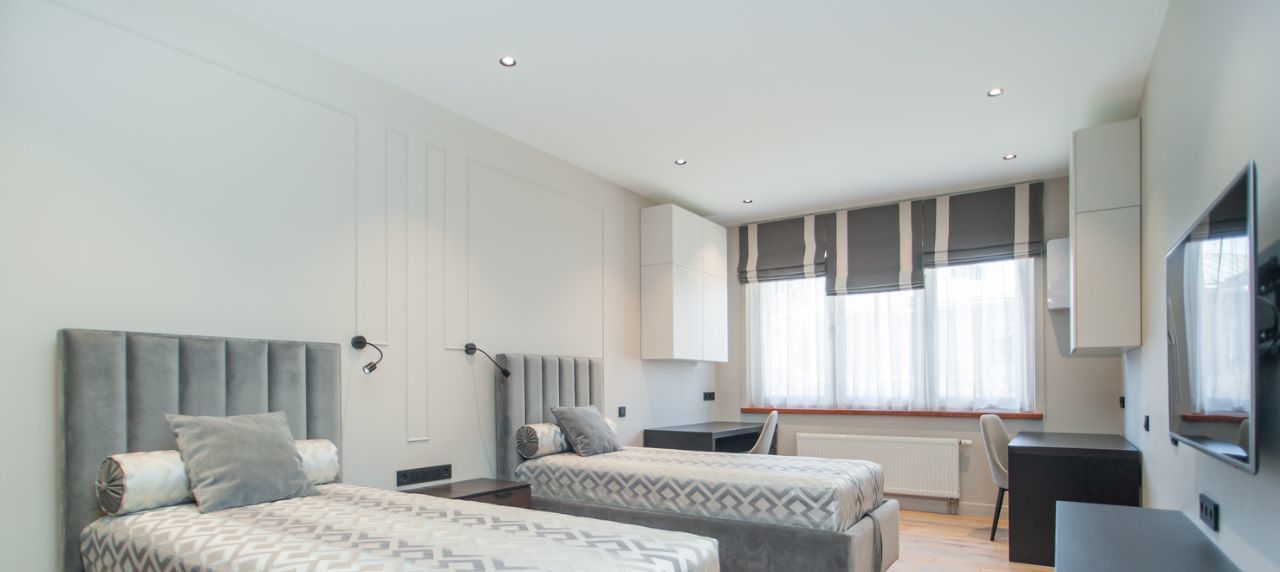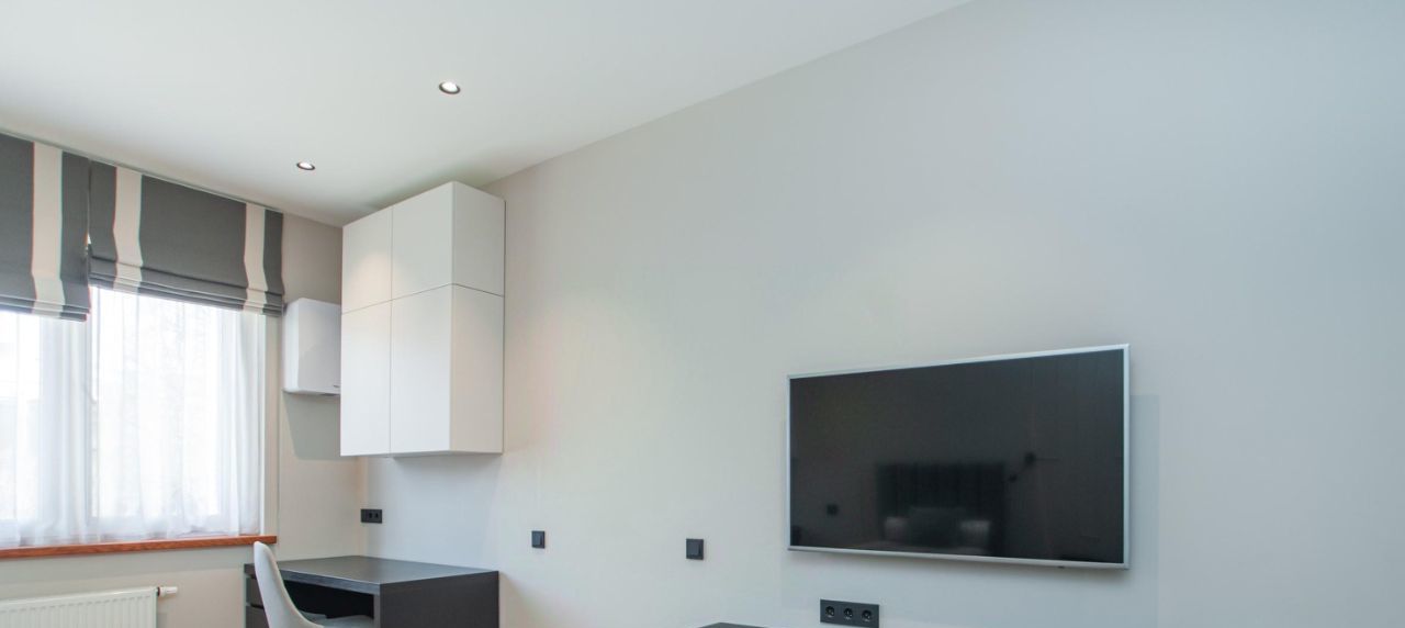 Детская комната: две отдельностоящие кровати 90х200 Idealbeds с ортопедическими матрасами Askona, два полностью оборудованных рабочих места с системами хранения (подвесные шкафы), Smart-TV Samsung с регулируемой по цветам подсветкой на тумба. Установлен бризер.