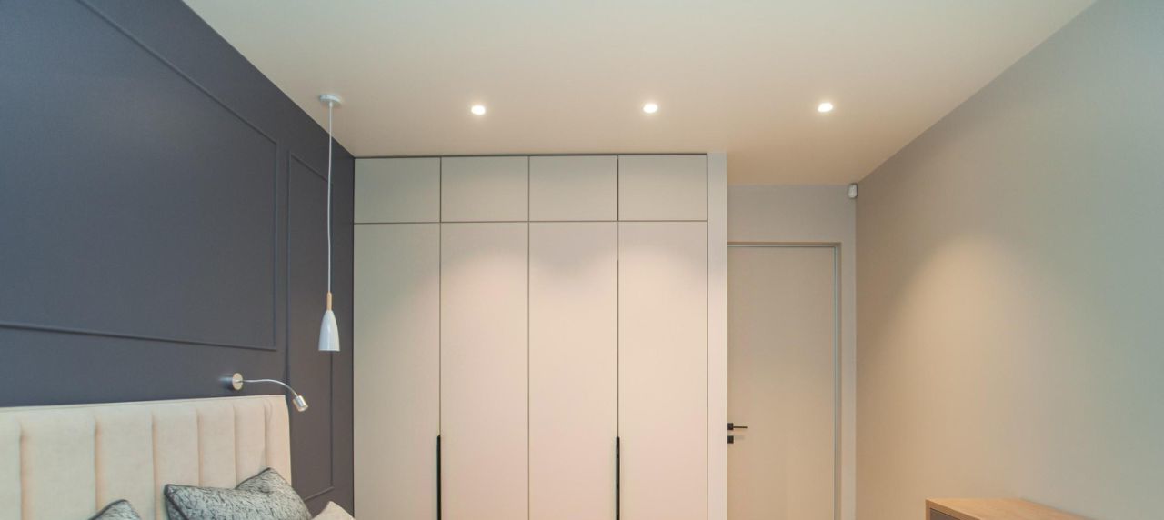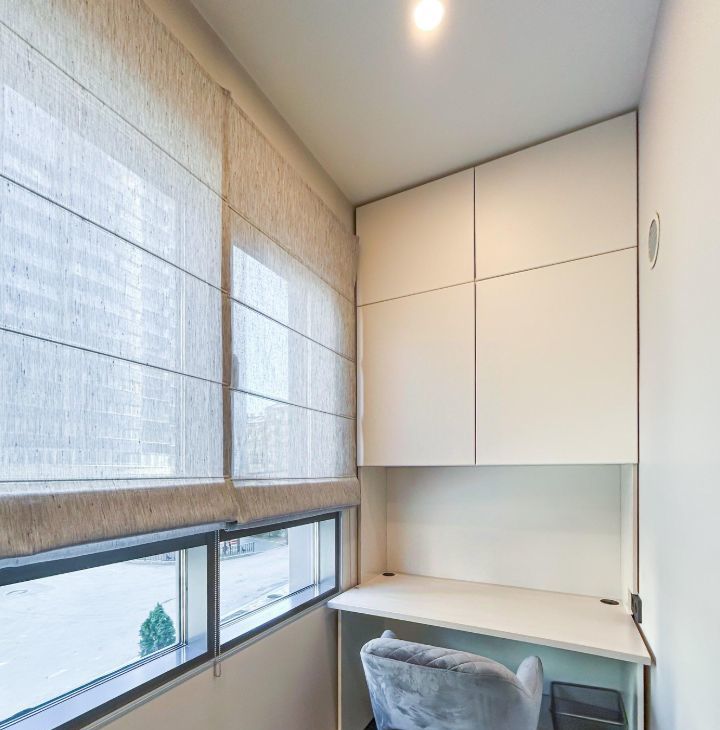 Родительская спальня: кровать 180x200 см с ортопедическим матрасом Askona, вместительный шкаф на 8 секций. Отдельный выход на теплую лоджию-кабинет.