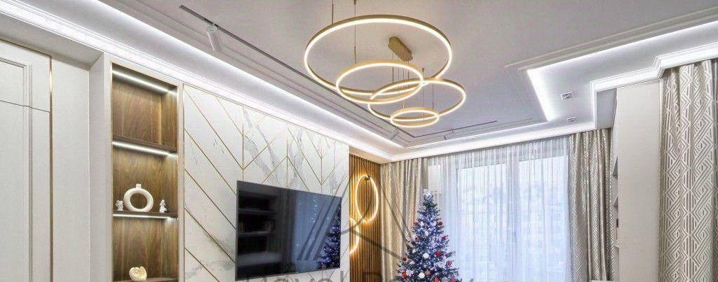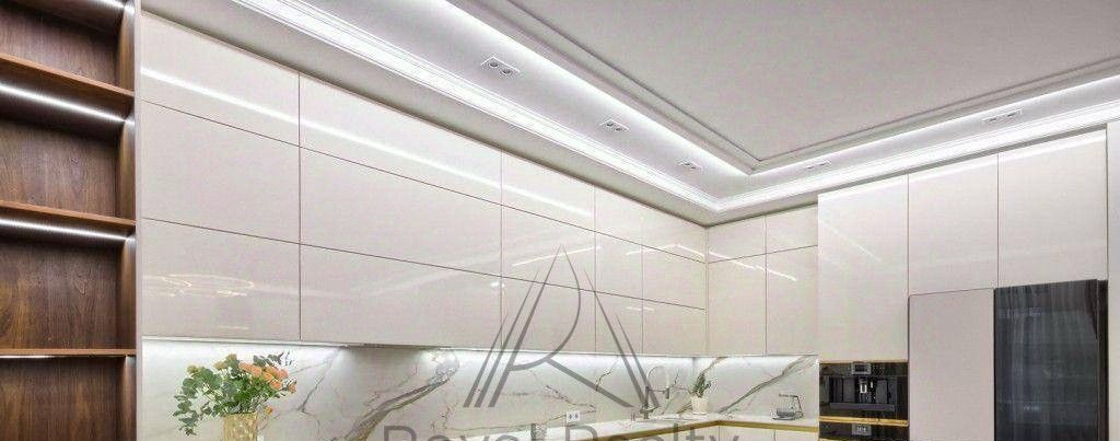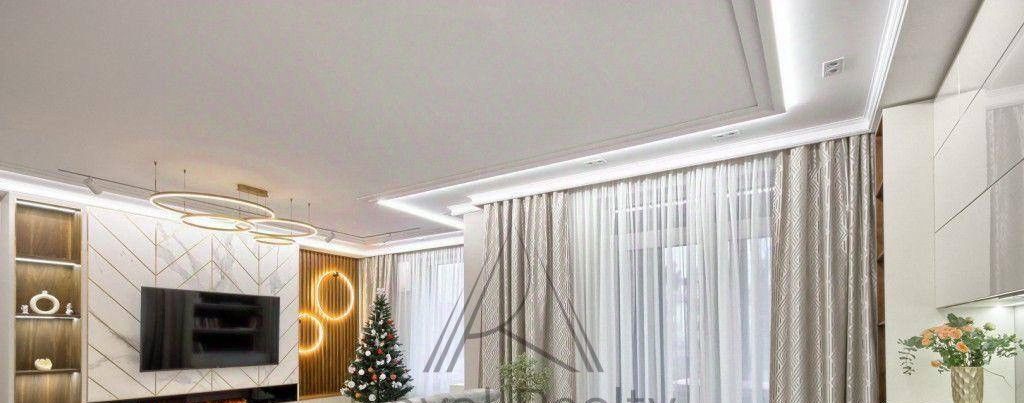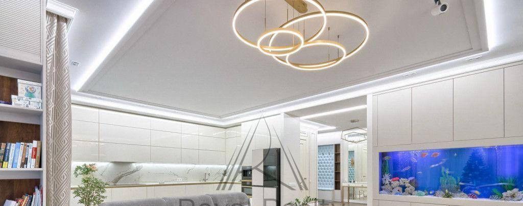 Просторная кухня-гостиная выполнена в современном стиле, со встроенной мебелью и техникой, что делает её уютной и функциональной.