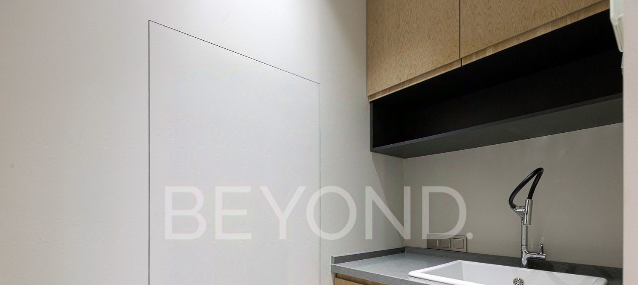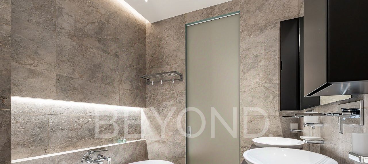 Интерьер выполнен в современном, лаконичном стиле без излишеств. В отделке использованы натуральные материалы: мраморные стены, паркет, премиальная плитка PORCELANOSA.