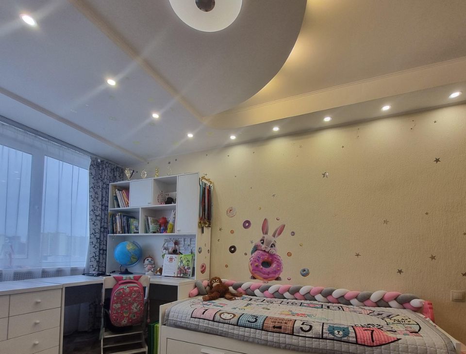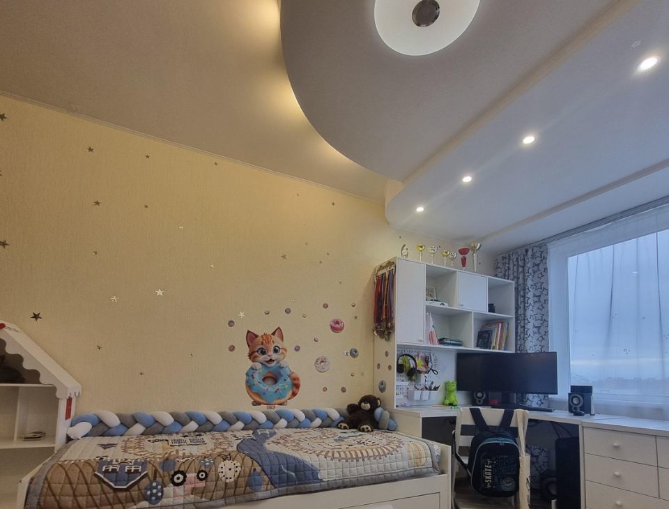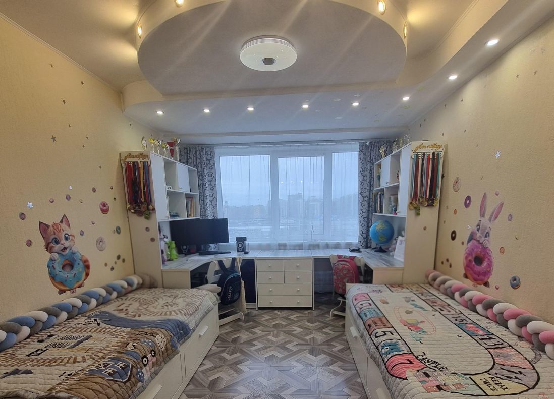 Детская: две раскладные кровати, большой стол с тумбочкой и полками, книжный шкаф в виде домика (кукольный), встроенный шкаф купе с зеркальными дверьми, кресло качалка на подставке, электрошторы (можно выставить время открытия и закрытия)
