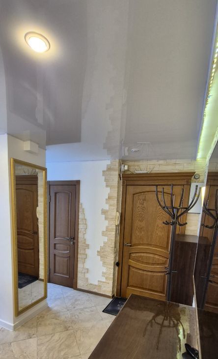 Гостиная: встроенные шкафы купе с зеркальными дверьми, диван кожаный раскладной, стол раздвижной 4 стула.
