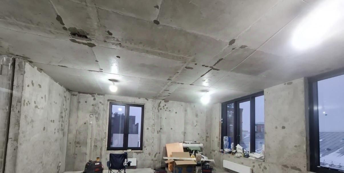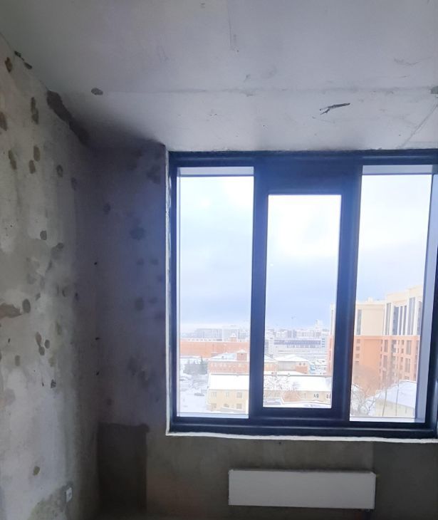 Пространство: Кухня-гостиная 25,81 м² с панорамными окнами. Есть возможность объединения с соседним помещением (перегородки не несущие) до 38,29 м².