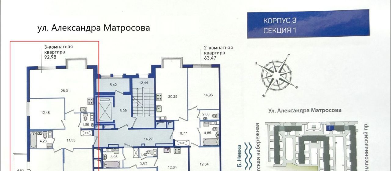 3-к кв. Санкт-Петербург ул. Александра Матросова, 1 (92.25 м²)