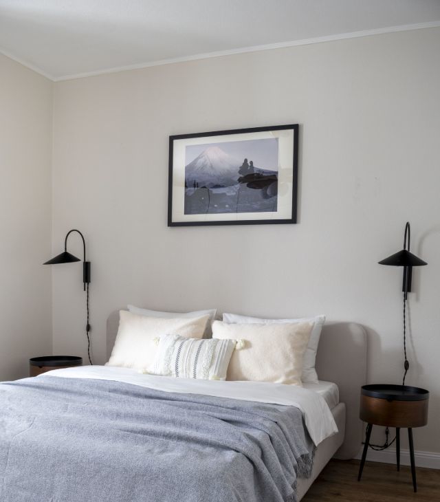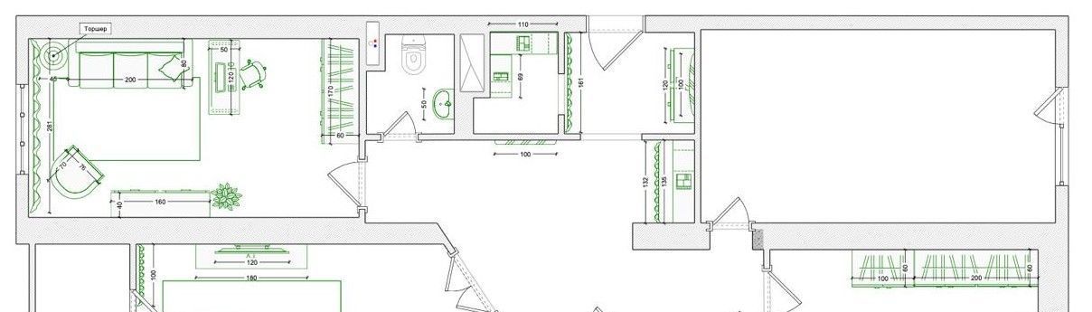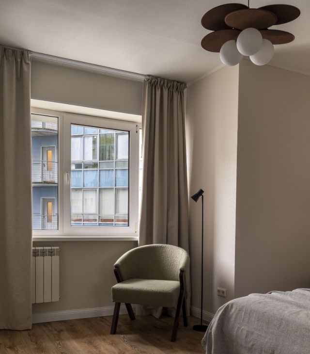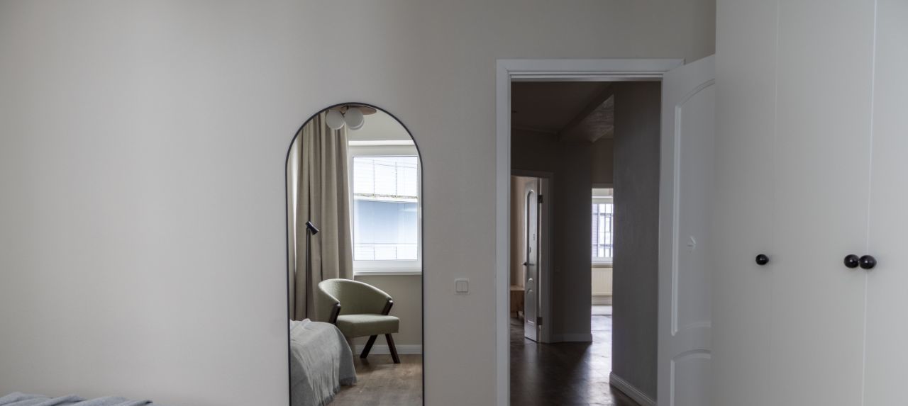 В противоположной части квартиры расположена большая спальня с кроватью 160200 см с подъёмным механизмом, прикроватными столиками, креслом, большим шкафом для одежды и зеркалом.