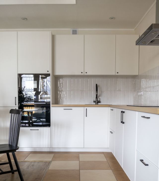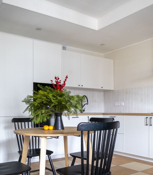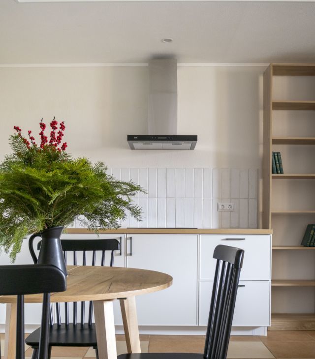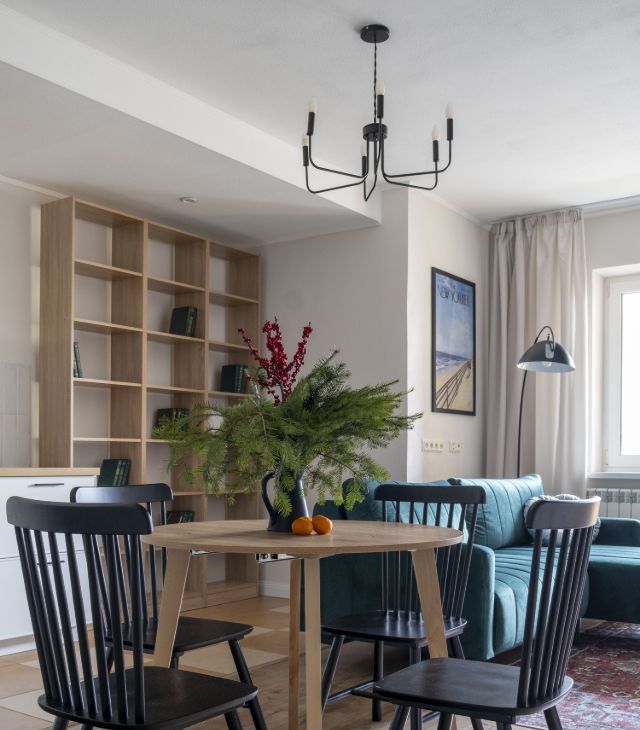 В просторной кухне-гостиной расположена угловая кухня со всей необходимой встроенной техникой: посудомоечная машина, плита, духовой шкаф, СВЧ, холодильник, вытяжка и фильтр для питьевой воды. В обеденной зоне — раскладной стол и стулья.