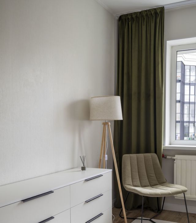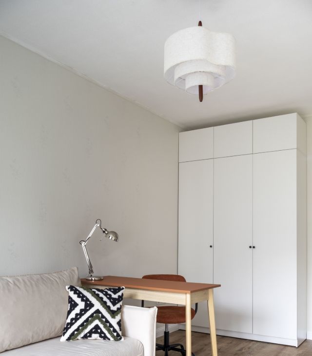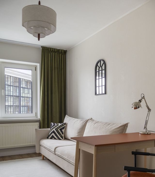 Комната рядом с гостиной может использоваться как детская, гостевая или кабинет. В ней есть раскладной диван со спальным местом 146196 см, письменный стол, стул, кресло, комод и шкаф для хранения.