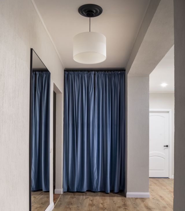 Прихожая оборудована двумя гардеробными системами, большой обувницей и зеркалом.