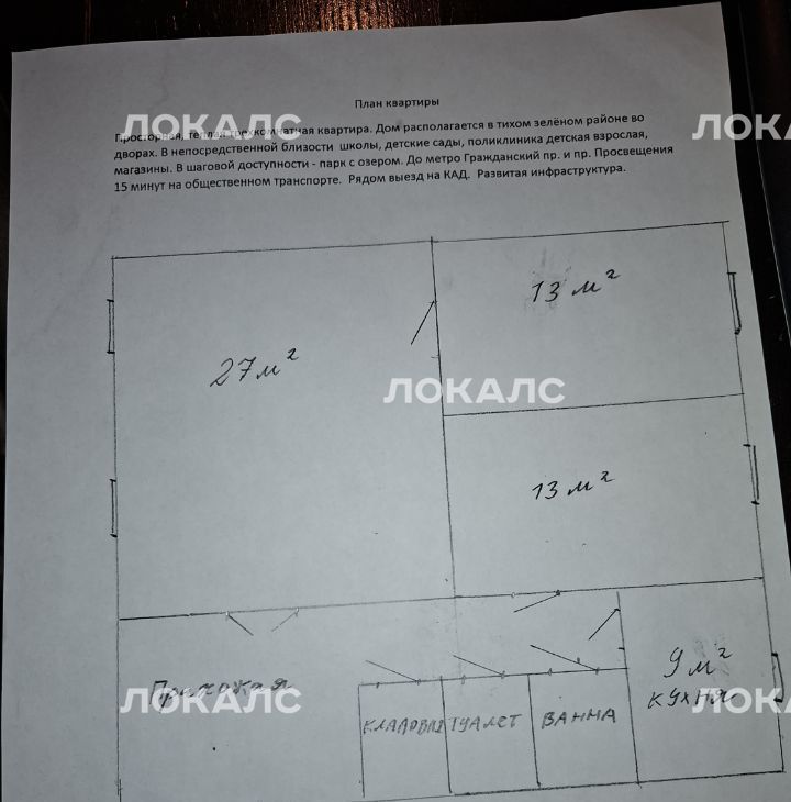 Просторная, теплая трехкомнатная квартира. Дом располагается в тихом зелёном районе во дворах. В непосредственной близости школы, детские сады, поликлиника детская взрослая, магазины. В шаговой доступности - парк с озером. До метро Гражданский пр. и пр. Просвещения 15 минут на общественном транспорте. Рядом выезд на КАД. Развитая инфраструктура.