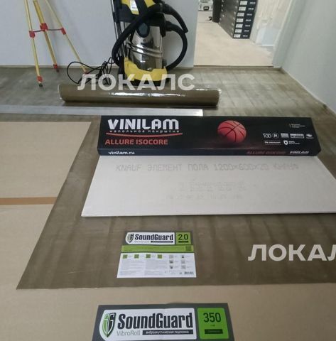 - Выполнена шумоизоляция полов в комнатах и кухни по проекту SaundGuard Basis+ с финишным покрытием замковым кварцвинилом 7,5 мм толщиной от Vinilam art.I967111 Дуб Розовато-Лиловый, со встроенной шумоизоляционной подложкой.